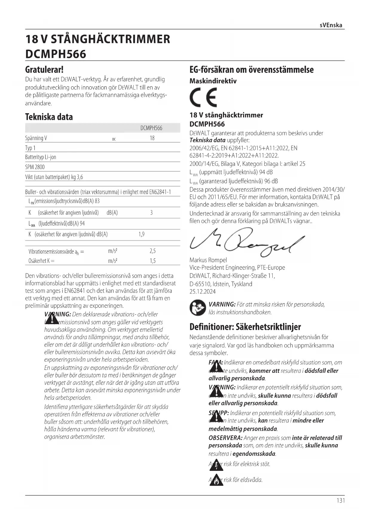(garanterad ljudeffektnivå) 96 dB Dessa produkter överensstämmer även med direktiven 2014/30/ EU och 2011/65/EU. För mer information, kontakta DeWALT på följande adress eller se baksidan av bruksanvisningen. Undertecknad är ansvarig för sammanställning av den tekniska filen och gör denna förklaring på DeWALTs vägnar.. Markus Rompel Vice-President Engineering, PTE-Europe DeWALT, Richard-Klinger-Straße 11, D-65510, Idstein, Tyskland