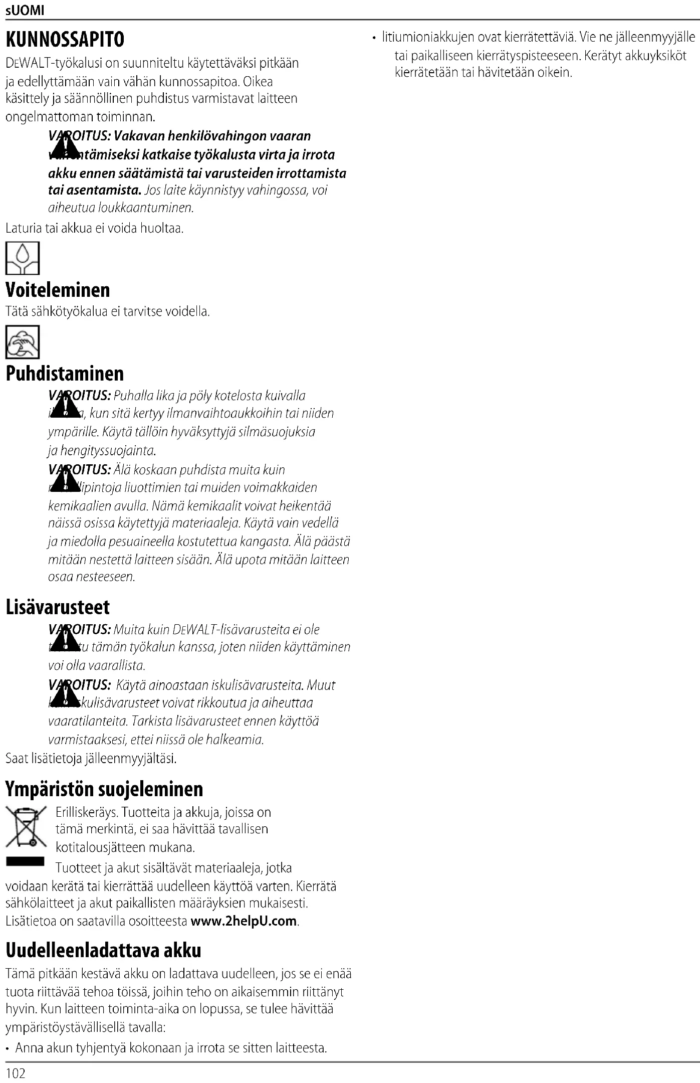 VARNING: Använd endast slagtillbehör. Icke-slagtillbehör kan brista och utgöra fara. Inspektera tillbehören innan användning för att garantera att den inte har sprickor. Rådfråga din återförsäljare för vidare information angående lämpligatillbehör. Att skydda miljön Separat insamling. Produkter och batterier som är märkta med denna symbol får inte kastas i den vanligahushållssoporna. Produkter och batterier innehåller material som kan återvinnas och återanvändas vilket minskar behovet av råmaterial. Återvinn elektriska produkter och batterier enligt lokala bestämmelser. Ytterligare information finns tillgängligt på www.2helpU.com. Laddningsbart Batteripaket Det här långlivade batteripaketet måste laddas när det inte längre producerar tillräcklig energi för arbeten som tidigare lätt utförts. Det bör omhändertas med lämpliga miljöhänsyn vid slutet av dess fungerande livslängd: