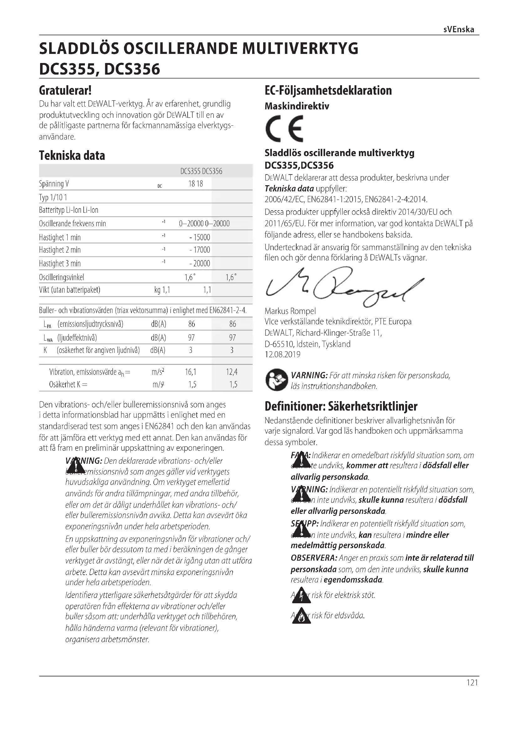 VARNING: Den deklarerade vibrations- och/eller bulleremissionsnivå som anges gäller vid verktygets huvudsakliga användning. Om verktyget emellertid används för andra tillämpningar, med andra tillbehör, eller om det är dåligt underhållet kan vibrations- och/ eller bulleremissionsnivån avvika. Detta kan avsevärt öka exponeringsnivån under helaarbetsperioden. En uppskattning av exponeringsnivån för vibrationer och/ eller buller bör dessutom ta med i beräkningen de gånger verktyget är avstängt, eller när det är igång utan att utföra arbete. Detta kan avsevärt minska exponeringsnivån under helaarbetsperioden. Identifiera ytterligare säkerhetsåtgärder för att skydda operatören från effekterna av vibrationer och/eller buller såsom att: underhålla verktyget och tillbehören, hålla händerna varma (relevant för vibrationer), organiseraarbetsmönster. EC-Följsamhetsdeklaration Maskindirektiv Sladdlös oscillerande multiverktyg DCS355, DCS356 DeWALT deklarerar att dessa produkter, beskrivna under Tekniska data uppfyller: 2006/42/EC, EN62841-1:2015, EN62841-2-4:2014. Dessa produkter uppfyller också direktiv 2014/30/EU och 2011/65/EU. För mer information, var god kontakta DeWALT på följande adress, eller se handbokensbaksida. Undertecknad är ansvarig för sammanställning av den tekniska filen och gör denna förklaring å DeWALTsvägnar. Markus Rompel VIce verkställande teknikdirektör, PTE Europa DeWALT, Richard-Klinger-Straße 11, D-65510, Idstein, Tyskland