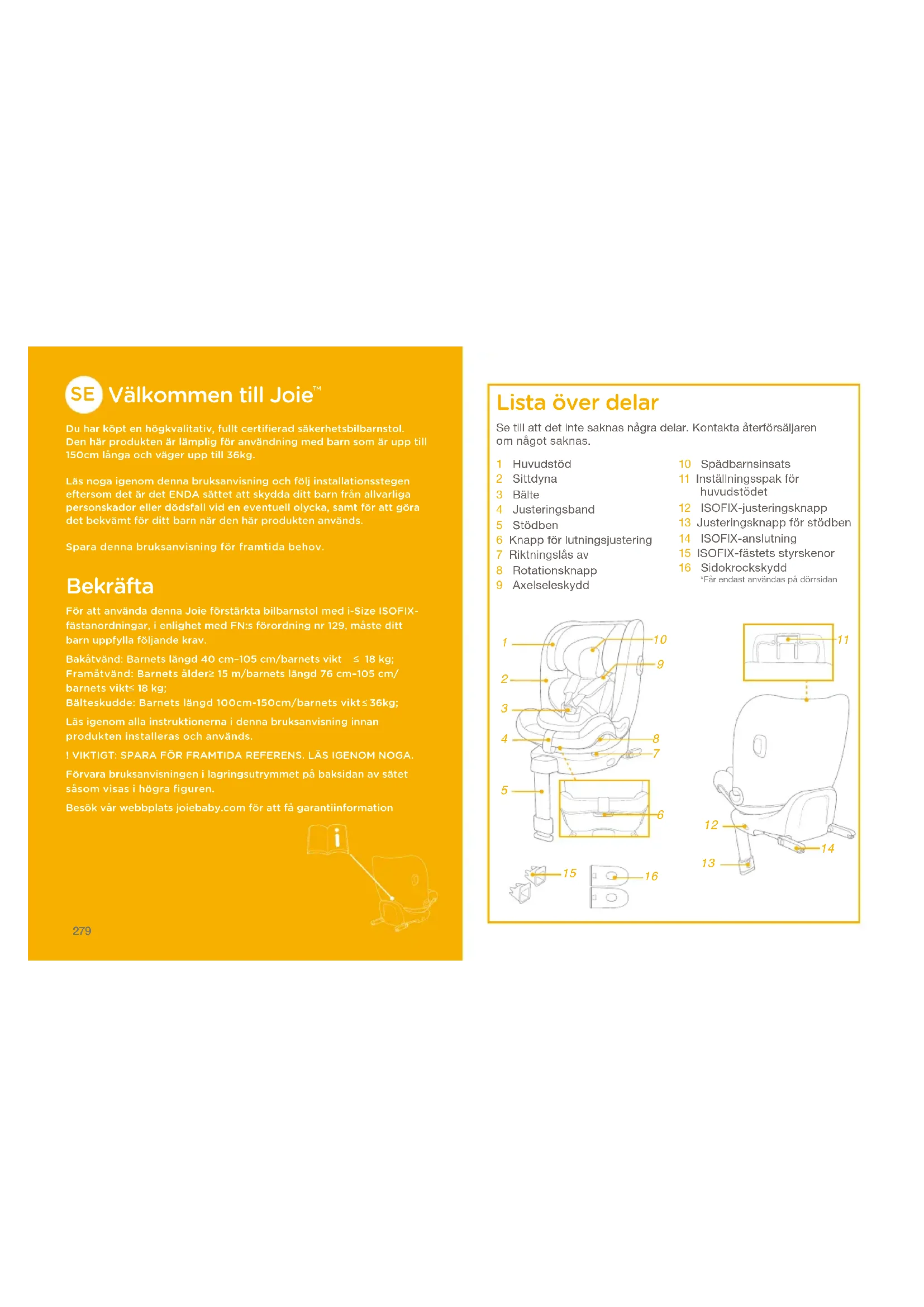 Du har köpt en högkvalitativ﹐ fullt certifierad säkerhetsbilbarnstol. Den här produkten är lämplig för användning med barn som är upp till 150cm långa och väger upp till 36kg.Läs noga igenom denna bruksanvisning och följ installationsstegen eftersom det är det ENDA sättet att skydda ditt barn från allvarliga personskador eller dödsfall vid en eventuell olycka﹐ samt för att göra det bekvämt för ditt barn när den här produkten används.Spara denna bruksanvisning för framtida behov. Bekräfta För att använda denna Joie förstärkta bilbarnstol med i-Size ISOFIX-fästanordningar﹐ i enlighet med FN:s förordning nr 129﹐ måste ditt barn uppfylla följande krav.Bakåtvänd: Barnets längd 40cm–105cm/barnets vikt 18kg; Framåtvänd: Barnets ålder 15m/barnets längd 76cm–105cm/ barnets vikt 18kg; Bälteskudde: Barnets längd 100cm-150cm/barnets vikt 36kg;Läs igenom alla instruktionerna i denna bruksanvisning innan produkten installeras och används.! VIKTIGT: SPARA FÖR FRAMTIDA REFERENS. LÄS IGENOM NOGA.Förvara bruksanvisningen i lagringsutrymmet på baksidan av sätet såsom visas i högra figuren. Besök vår webbplats joiebaby.com för att få garantiinformation Lista över delar 1 Huvudstöd2 Sittdyna3 Bälte4 Justeringsband5 Stödben6 Knapp för lutningsjustering7 Riktningslås av8 Rotationsknapp9 Axelseleskydd10 Spädbarnsinsats11 Inställningsspak för huvudstödet12 ISOFIX-justeringsknapp13 Justeringsknapp för stödben14 ISOFIX-anslutning15 ISOFIX-fästets styrskenor16 Sidokrockskydd*Får endast användas på dörrsidanSe till att det inte saknas några delar. Kontakta återförsäljaren om något saknas.
