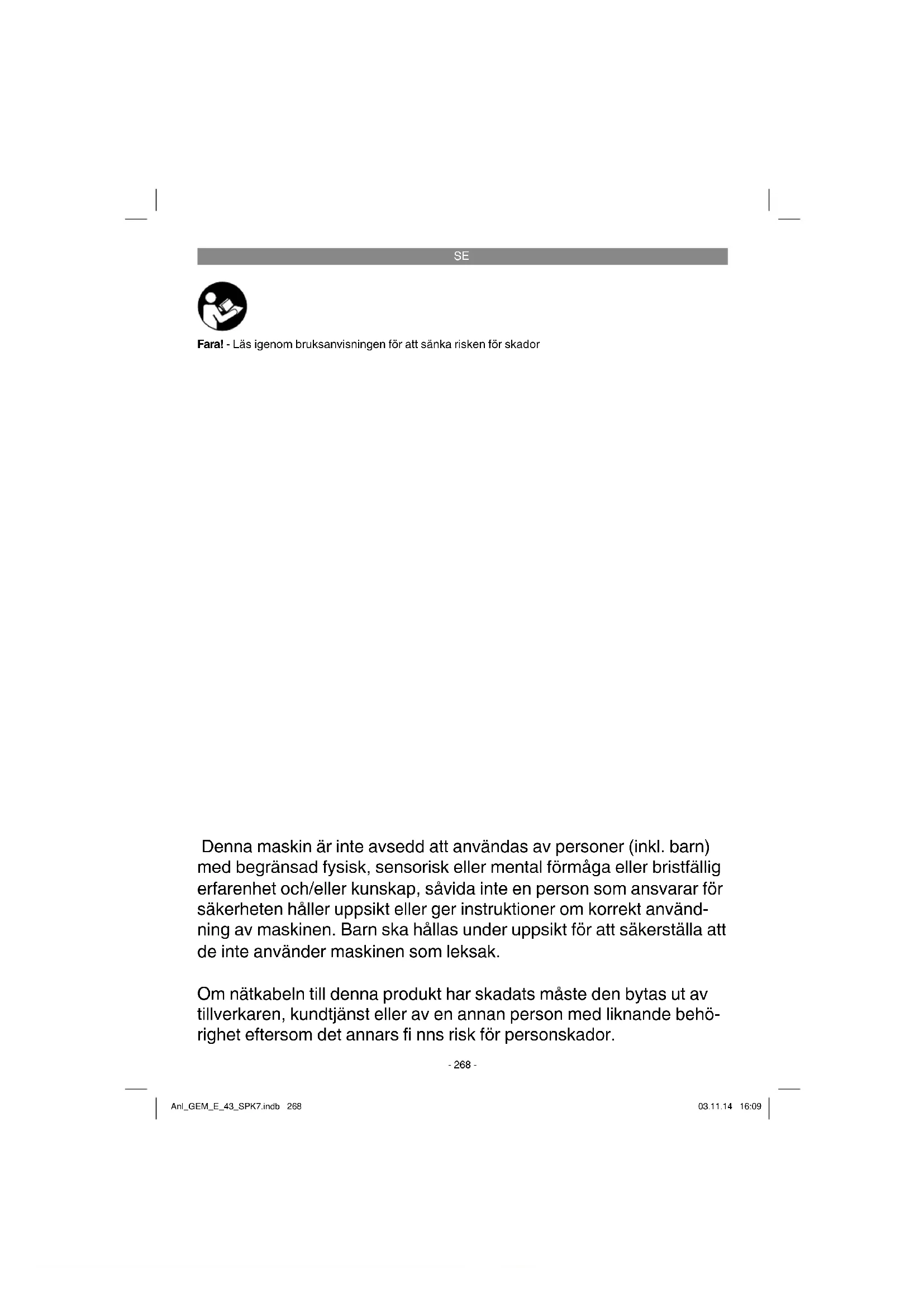 Fara! - Läs igenom bruksanvisningen för att sänka risken för skador Denna maskin är inte avsedd att användas av personer (inkl. barn) med begränsad fysisk, sensorisk eller mental förmåga eller bristfällig erfarenhet och/eller kunskap, såvida inte en person som ansvarar för säkerheten håller uppsikt eller ger instruktioner om korrekt använd- ning av maskinen. Barn ska hållas under uppsikt för att säkerställa att de inte använder maskinen som leksak. Om nätkabeln till denna produkt har skadats måste den bytas ut av tillverkaren, kundtjänst eller av en annan person med liknande behö- righet eftersom det annars fi nns risk för personskador. Anl_GEM_E_43_SPK7.indb 268Anl_GEM_E_43_SPK7.indb 268 03.11.14 16:0903.11.14 16:09SE