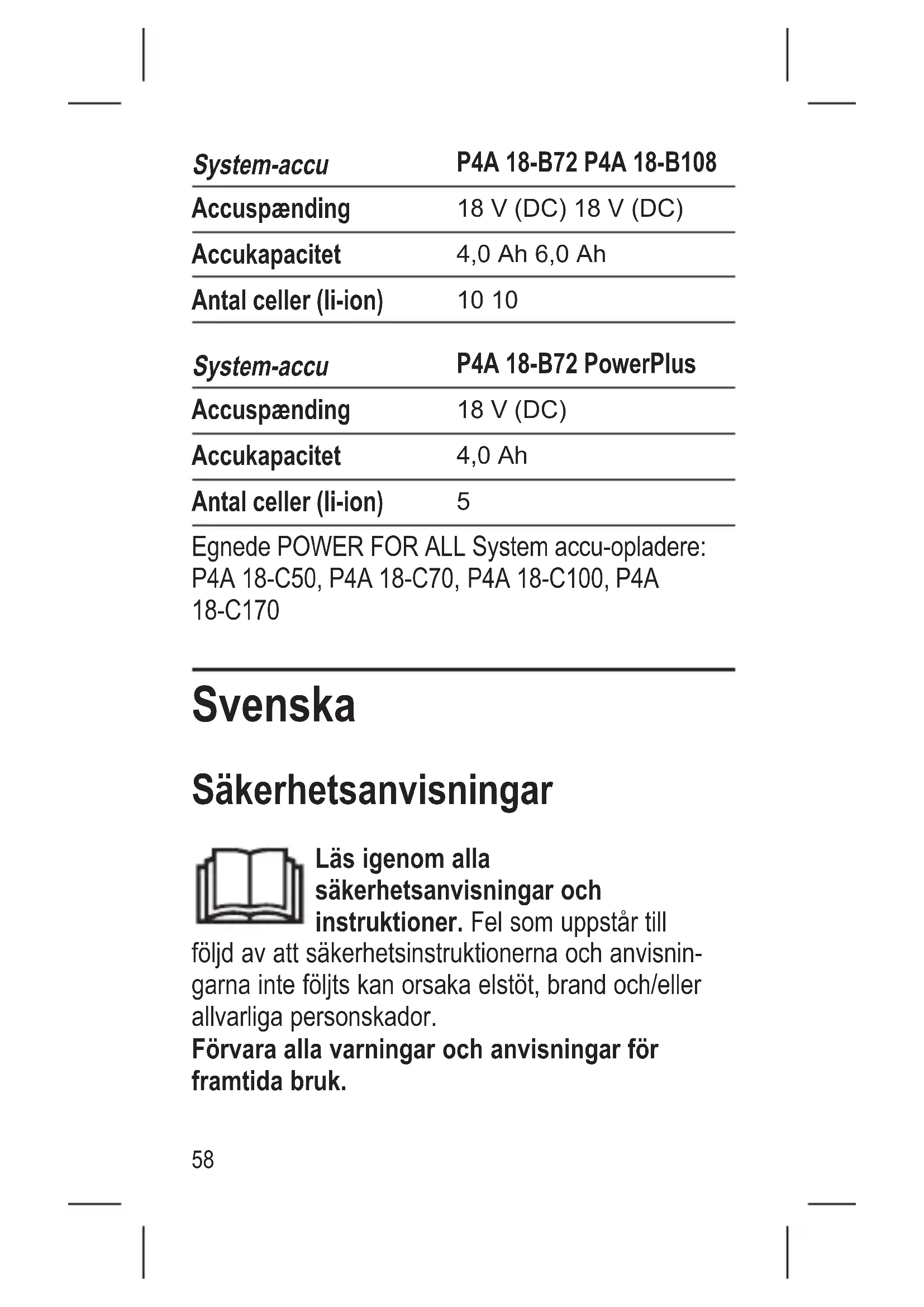 Egnede POWER FOR ALL System accu-opladere: P4A 18-C50, P4A 18-C70, P4A 18-C100, P4A 18-C170 Svenska Säkerhetsanvisningar Läs igenom alla säkerhetsanvisningar och instruktioner. Fel som uppstår till följd av att säkerhetsinstruktionerna och anvisnin- garna inte följts kan orsaka elstöt, brand och/eller allvarliga personskador. Förvara alla varningar och anvisningar för framtida bruk. 58→ Dessa säkerhetsanvisningar gäller endast 18V litiumjonbatterier i POWER FOR ALL-systemet.