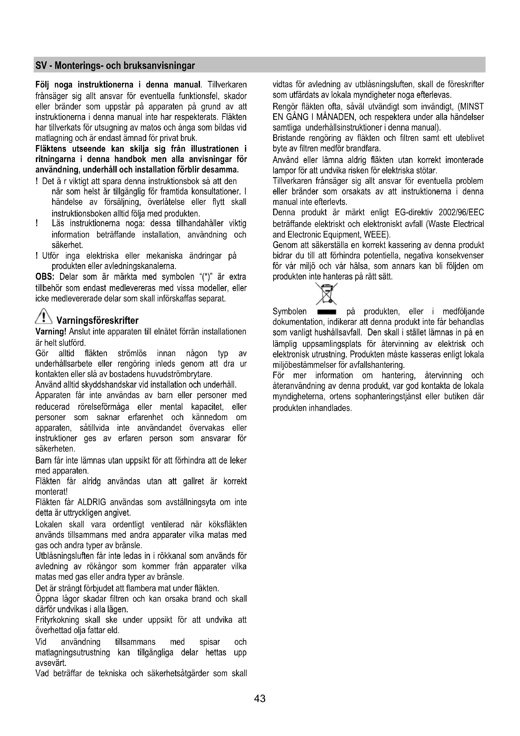 Για την αντικατάσταση τους, απευθυνθείτε στην υπηρεσία τεχνικής βοήθειας43 SV - Monterings- och bruksanvisningar Följ noga instruktionerna i denna manual. Tillverkaren frånsäger sig allt ansvar för eventuella funktionsfel, skador eller bränder som uppstår på apparaten på grund av att instruktionerna i denna manual inte har respekterats. Fläkten har tillverkats för utsugning av matos och ånga som bildas vid matlagning och är endast ämnad för privat bruk. Fläktens utseende kan skilja sig från illustrationen i ritningarna i denna handbok men alla anvisningar för användning, underhåll och installation förblir desamma. ! Det ä r viktigt att spara denna instruktionsbok så att den när som helst är tillgänglig för framtida konsultationer. I händelse av försäljning, överlåtelse eller flytt skall instruktionsboken alltid följa med produkten. ! Läs instruktionerna noga: dessa tillhandahåller viktig information beträffande installation, användning och säkerhet. ! Utför inga elektriska eller mekaniska ändringar på produkten eller avledningskanalerna. OBS: Delar som är märkta med symbolen “(*)” är extra tillbehör som endast medlevereras med vissa modeller, eller icke medlevererade delar som skall införskaffas separat. Varningsföreskrifter Varning! Anslut inte apparaten till elnätet förrän installationen är helt slutförd. Gör alltid fläkten strömlös innan någon typ av underhållsarbete eller rengöring inleds genom att dra ur kontakten eller slå av bostadens huvudströmbrytare. Använd alltid skyddshandskar vid installation och underhåll. Apparaten får inte användas av barn eller personer med reducerad rörelseförmåga eller mental kapacitet, eller personer som saknar erfarenhet och kännedom om apparaten, såtillvida inte användandet övervakas eller instruktioner ges av erfaren person som ansvarar för säkerheten. Barn får inte lämnas utan uppsikt för att förhindra att de leker med apparaten. Fläkten får alridg användas utan att gallret är korrekt monterat! Fläkten får ALDRIG användas som avställningsyta om inte detta är uttryckligen angivet. Lokalen skall vara ordentligt ventilerad när köksfläkten används tillsammans med andra apparater vilka matas med gas och andra typer av bränsle. Utblåsningsluften får inte ledas in i rökkanal som används för avledning av rökångor som kommer från apparater vilka matas med gas eller andra typer av bränsle. Det är strängt förbjudet att flambera mat under fläkten. Öppna lågor skadar filtren och kan orsaka brand och skall därför undvikas i alla lägen. Frityrkokning skall ske under uppsikt för att undvika att överhettad olja fattar eld. Vid användning tillsammans med spisar och matlagningsutrustning kan tillgängliga delar hettas upp avsevärt. Vad beträffar de tekniska och säkerhetsåtgärder som skall vidtas för avledning av utblåsningsluften, skall de föreskrifter som utfärdats av lokala myndigheter noga efterlevas. Rengör fläkten ofta, såväl utvändigt som invändigt, (MINST EN GÅNG I MÅNADEN, och respektera under alla händelser samtliga underhållsinstruktioner i denna manual). Bristande rengöring av fläkten och filtren samt ett uteblivet byte av filtren medför brandfara. Använd eller lämna aldrig fläkten utan korrekt imonterade lampor för att undvika risken för elektriska stötar. Tillverkaren frånsäger sig allt ansvar för eventuella problem eller bränder som orsakats av att instruktionerna i denna manual inte efterlevts. Denna produkt är märkt enligt EG-direktiv 2002/96/EEC beträffande elektriskt och elektroniskt avfall (Waste Electrical and Electronic Equipment, WEEE). Genom att säkerställa en korrekt kassering av denna produkt bidrar du till att förhindra potentiella, negativa konsekvenser för vår miljö och vår hälsa, som annars kan bli följden om produkten inte hanteras på rätt sätt. Symbolen på produkten, eller i medföljande dokumentation, indikerar att denna produkt inte får behandlas som vanligt hushållsavfall. Den skall i stället lämnas in på en lämplig uppsamlingsplats för återvinning av elektrisk och elektronisk utrustning. Produkten måste kasseras enligt lokala miljöbestämmelser för avfallshantering. För mer information om hantering, återvinning och återanvändning av denna produkt, var god kontakta de lokala myndigheterna, ortens sophanteringstjänst eller butiken där produkten inhandlades.44 Användning Fläkten har tillverkats för att användas som utsugningsversion med utvändig evakuering eller som filterversion med intern återcirkulation. Utsugningsversion Matoset leds ut ur lokalen med hjälp av ett avledningsrör som är fixerat på anslutningsflänsen. Avledningsröret skall ha samma diameter som anslutningsflänsen. Varning! Avledningsröret medlevereras inte och skall införskaffas separat. Röret skall, även när det är horisontellt draget, alltid luta lätt (cirka 10°) uppåt, så att luften lätt kan ledas ut ur lokalen. I det fall fläkten är försedd med kolfilter skall dessa tas ur. Rören och utloppsöppningarna i väggen med vilka fläkten skall anslutas bör ha samma diameter som luftutsläppet (anslutningsflänsen). I det fall man använder rör och utloppsöppningar i väggen med mindre diameter medför detta en lägre utblåsprestanda och en drastisk förhöjning av bullernivån. Vi avsäger oss därför allt ansvar gällande denna typ av problem. ! Använd ett så kort rör som möjligt. ! Röret skall vara så rakt som möjligt (högsta tillåtna vinkel på böjarna 90°). ! Undvik stora skillnader i rörets tvärsnittsarea. ! Använd rör vars insida är så slät som möjligt. ! Röret skall vara tillverkat av i lag godkända material. Filterversion Den utsugna luften avfettas och befrias från odörer innan den leds ut i lokalen igen. När fläkten används med denna version är det nödvändigt