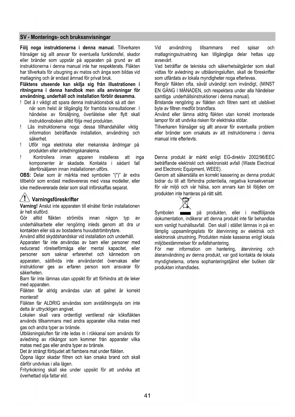 Για την αντικατάσταση τους, απευθυνθείτε στην υπηρεσία τεχνικής βοήθειας41 SV - Monterings- och bruksanvisningar Följ noga instruktionerna i denna manual. Tillverkaren frånsäger sig allt ansvar för eventuella funktionsfel, skador eller bränder som uppstår på apparaten på grund av att instruktionerna i denna manual inte har respekterats. Fläkten har tillverkats för utsugning av matos och ånga som bildas vid matlagning och är endast ämnad för privat bruk. Fläktens utseende kan skilja sig från illustrationen i ritningarna i denna handbok men alla anvisningar för användning, underhåll och installation förblir desamma. ! Det ä r viktigt att spara denna instruktionsbok så att den när som helst är tillgänglig för framtida konsultationer. I händelse av försäljning, överlåtelse eller flytt skall instruktionsboken alltid följa med produkten. ! Läs instruktionerna noga: dessa tillhandahåller viktig information beträffande installation, användning och säkerhet. ! Utför inga elektriska eller mekaniska ändringar på produkten eller avledningskanalerna. ! Kontrollera innan apparen installeras att inga komponenter är skadade. Kontakta i sådant fall återförsäljaren innan installationen utförs. OBS: Delar som är märkta med symbolen “(*)” är extra tillbehör som endast medlevereras med vissa modeller, eller icke medlevererade delar som skall införskaffas separat. Varningsföreskrifter Varning! Anslut inte apparaten till elnätet förrän installationen är helt slutförd. Gör alltid fläkten strömlös innan någon typ av underhållsarbete eller rengöring inleds genom att dra ur kontakten eller slå av bostadens huvudströmbrytare. Använd alltid skyddshandskar vid installation och underhåll. Apparaten får inte användas av barn eller personer med reducerad rörelseförmåga eller mental kapacitet, eller personer som saknar erfarenhet och kännedom om apparaten, såtillvida inte användandet övervakas eller instruktioner ges av erfaren person som ansvarar för säkerheten. Barn får inte lämnas utan uppsikt för att förhindra att de leker med apparaten. Fläkten får alridg användas utan att gallret är korrekt monterat! Fläkten får ALDRIG användas som avställningsyta om inte detta är uttryckligen angivet. Lokalen skall vara ordentligt ventilerad när köksfläkten används tillsammans med andra apparater vilka matas med gas och andra typer av bränsle. Utblåsningsluften får inte ledas in i rökkanal som används för avledning av rökångor som kommer från apparater vilka matas med gas eller andra typer av bränsle. Det är strängt förbjudet att flambera mat under fläkten. Öppna lågor skadar filtren och kan orsaka brand och skall därför undvikas i alla lägen. Frityrkokning skall ske under uppsikt för att undvika att överhettad olja fattar eld. Vid användning tillsammans med spisar och matlagningsutrustning kan tillgängliga delar hettas upp avsevärt. Vad beträffar de tekniska och säkerhetsåtgärder som skall vidtas för avledning av utblåsningsluften, skall de föreskrifter som utfärdats av lokala myndigheter noga efterlevas. Rengör fläkten ofta, såväl utvändigt som invändigt, (MINST EN GÅNG I MÅNADEN, och respektera under alla händelser samtliga underhållsinstruktioner i denna manual). Bristande rengöring av fläkten och filtren samt ett uteblivet byte av filtren medför brandfara. Använd eller lämna aldrig fläkten utan korrekt imonterade lampor för att undvika risken för elektriska stötar. Tillverkaren frånsäger sig allt ansvar för eventuella problem eller bränder som orsakats av att instruktionerna i denna manual inte efterlevts.