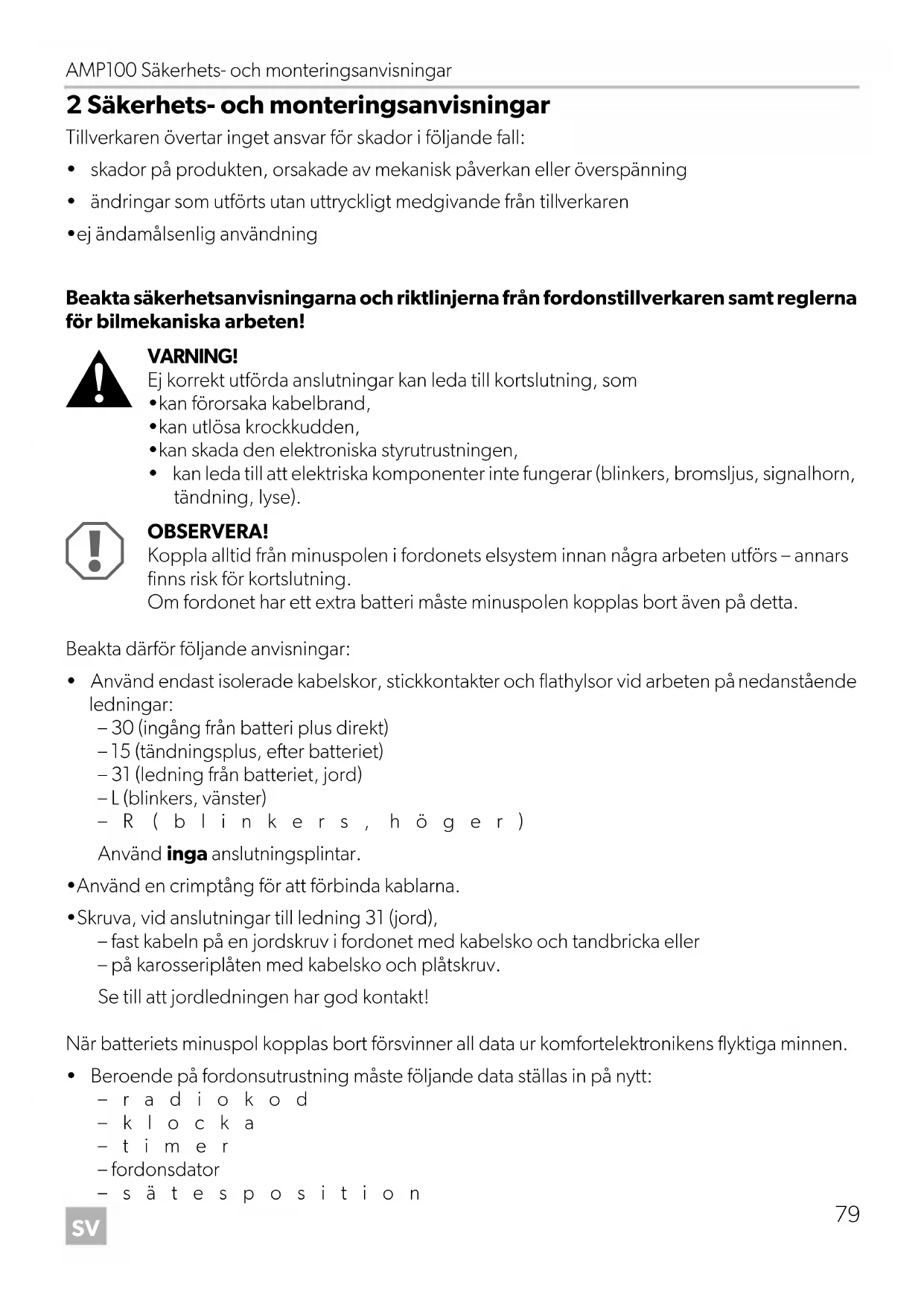 - Beroende på fordonsutrustning måste följande data ställas in på nytt: –radiokod –klocka –timer – fordonsdator –sätesposition AMP100-IO-16s.book Seite 79 Mittwoch, 26. Oktober 2016 11:15 11Säkerhets- och monteringsanvisningar AMP100