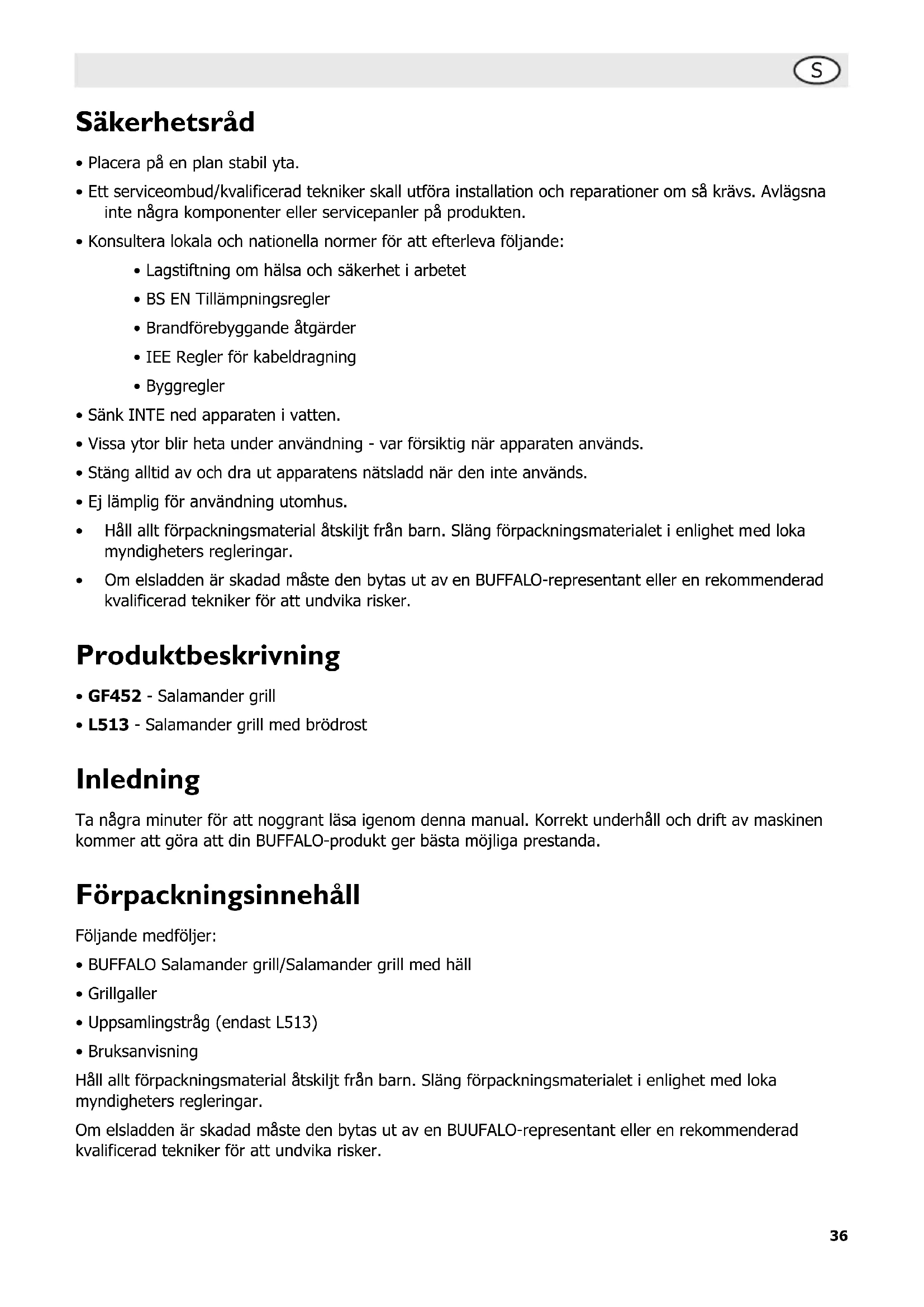 - L513 - Salamander grill med brödrost Inledning Ta några minuter för att noggrant läsa igenom denna manual. Korrekt underhåll och drift av maskinen kommer att göra att din BUFFALO-produkt ger bästa möjliga prestanda. Förpackningsinnehåll Följande medföljer: