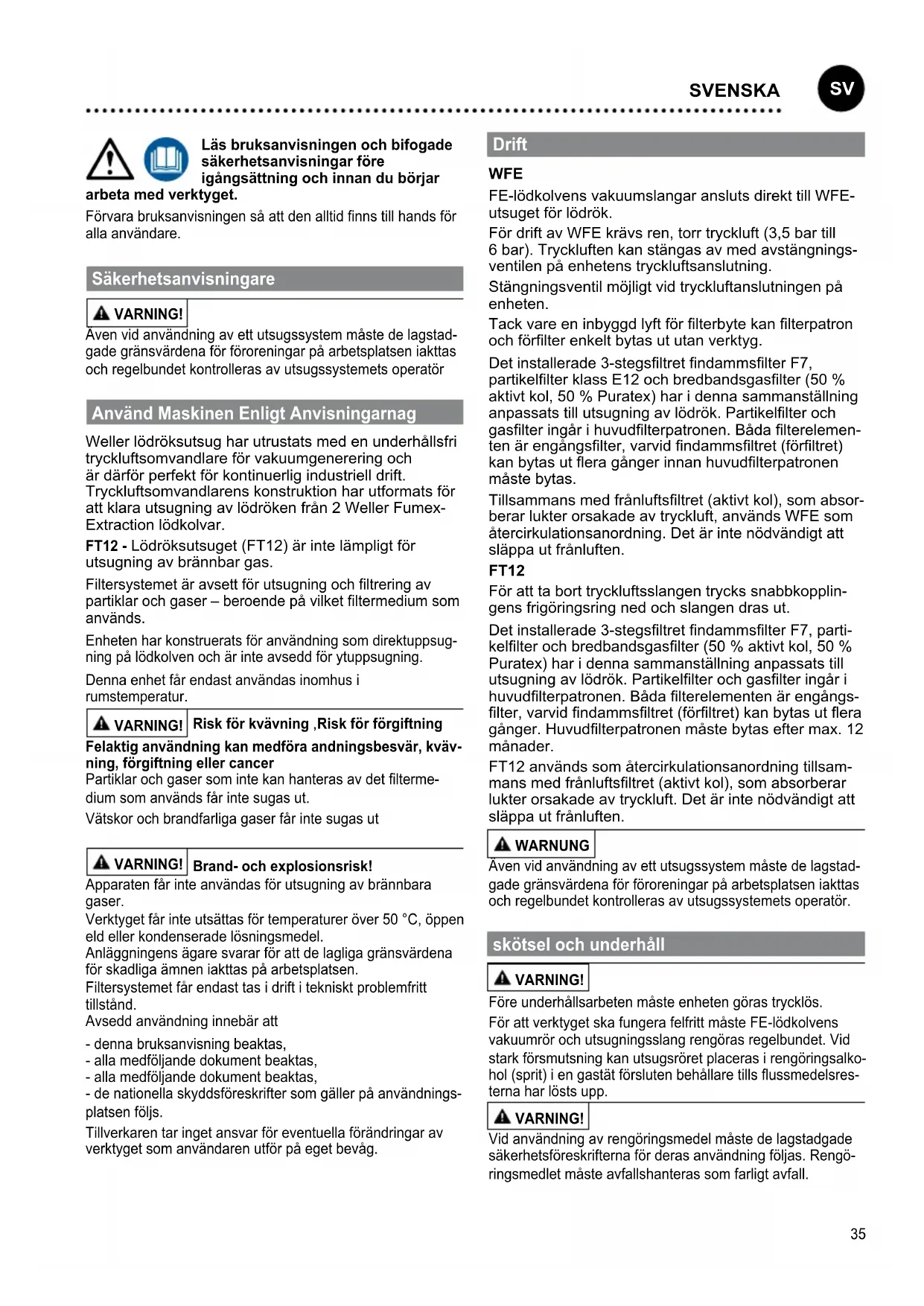 NEDERLANDS Symbolen Attentie! Bedieningshandleiding lezen! ESD-conform design en ESD-conforme werkplek Beknellingsgevaar Afvoer Afgedankte elektrische en elektronische apparatuur moeten gescheiden ingezameld en afgevoerd worden. Verwijder de verlichtingsmiddelen uit de apparatuur voordat u deze afvoert. Informeer bij uw gemeente of bij uw vakhandelaar naar recyclingbedrijven en inzamelpunten. Al naargelang de lokaal van toepassing zijnde voorschriften kunnen detailhandelaren verplicht zijn om afgedankte elektrische en elektronische apparatuur kosteloos terug te nemen. Geef uw afgedankte elektrische en elektronische apparatuur af voor recycling en help zo mee om de behoefte aan grondstoffen te verminderen. Afgedankte elektrische en elektronische apparatuur bevatten waardevolle, recyclebare materialen die, mits ze niet milieuvriendelijk worden afgevoerd, negatieve gevolgen kunnen hebben voor het milieu en uw gezondheid. Verwijder persoonlijke gegevens van uw afgedankte apparatuur voordat u deze afvoert. Voer vervangen toestelonderdelen, lters of oude toestel conform de voorschriften van uw land af. Vervuilde lters moeten als gevaarlijk afval worden behandeld. CE-teken Brits symbool van overeenstemming35 Läs bruksanvisningen och bifogade säkerhetsanvisningar före igångsättning och innan du börjar arbeta med verktyget. Förvara bruksanvisningen så att den alltid nns till hands för alla användare. Säkerhetsanvisningare VARNING! Även vid användning av ett utsugssystem måste de lagstad- gade gränsvärdena för föroreningar på arbetsplatsen iakttas och regelbundet kontrolleras av utsugssystemets operatör Använd Maskinen Enligt Anvisningarnag Weller lödröksutsug har utrustats med en underhållsfri tryckluftsomvandlare för vakuumgenerering och är därför perfekt för kontinuerlig industriell drift. Tryckluftsomvandlarens konstruktion har utformats för att klara utsugning av lödröken från 2 Weller Fumex- Extraction lödkolvar. FT12 - Lödröksutsuget (FT12) är inte lämpligt för utsugning av brännbar gas. Filtersystemet är avsett för utsugning och ltrering av partiklar och gaser – beroende på vilket ltermedium som används. Enheten har konstruerats för användning som direktuppsug- ning på lödkolven och är inte avsedd för ytuppsugning. Denna enhet får endast användas inomhus i rumstemperatur. VARNING! Risk för kvävning , Risk för förgiftning Felaktig användning kan medföra andningsbesvär, kväv- ning, förgiftning eller cancer Partiklar och gaser som inte kan hanteras av det lterme- dium som används får inte sugas ut. Vätskor och brandfarliga gaser får inte sugas ut VARNING! Brand- och explosionsrisk! Apparaten får inte användas för utsugning av brännbara gaser. Verktyget får inte utsättas för temperaturer över 50 °C, öppen eld eller kondenserade lösningsmedel. Anläggningens ägare svarar för att de lagliga gränsvärdena för skadliga ämnen iakttas på arbetsplatsen. Filtersystemet får endast tas i drift i tekniskt problemfritt tillstånd. Avsedd användning innebär att - denna bruksanvisning beaktas, - alla medföljande dokument beaktas, - alla medföljande dokument beaktas, - de nationella skyddsföreskrifter som gäller på användnings- platsen följs. Tillverkaren tar inget ansvar för eventuella förändringar av verktyget som användaren utför på eget bevåg. Drift WFE FE-lödkolvens vakuumslangar ansluts direkt till WFE- utsuget för lödrök. För drift av WFE krävs ren, torr tryckluft (3,5 bar till 6 bar). Tryckluften kan stängas av med avstängnings- ventilen på enhetens tryckluftsanslutning. Stängningsventil möjligt vid tryckluftanslutningen på enheten. Tack vare en inbyggd lyft för lterbyte kan lterpatron och förlter enkelt bytas ut utan verktyg. Det installerade 3-stegsltret ndammslter F7, partikellter klass E12 och bredbandsgaslter (50 % aktivt kol, 50 % Puratex) har i denna sammanställning anpassats till utsugning av lödrök. Partikellter och gaslter ingår i huvudlterpatronen. Båda lterelemen- ten är engångslter, varvid ndammsltret (förltret) kan bytas ut era gånger innan huvudlterpatronen måste bytas. Tillsammans med frånluftsltret (aktivt kol), som absor- berar lukter orsakade av tryckluft, används WFE som återcirkulationsanordning. Det är inte nödvändigt att släppa ut frånluften. FT12 För att ta bort tryckluftsslangen trycks snabbkopplin- gens frigöringsring ned och slangen dras ut. Det installerade 3-stegsltret ndammslter F7, parti- kellter och bredbandsgaslter (50 % aktivt kol, 50 % Puratex) har i denna sammanställning anpassats till utsugning av lödrök. Partikellter och gaslter ingår i huvudlterpatronen. Båda lterelementen är engångs- lter, varvid ndammsltret (förltret) kan bytas ut era gånger. Huvudlterpatronen måste bytas efter max. 12 månader. FT12 används som återcirkulationsanordning tillsam- mans med frånluftsltret (aktivt kol), som absorberar lukter orsakade av tryckluft. Det är inte nödvändigt att släppa ut frånluften. WARNUNG Även vid användning av ett utsugssystem måste de lagstad- gade gränsvärdena för föroreningar på arbetsplatsen iakttas och regelbundet kontrolleras av utsugssystemets operatör. skötsel och underhåll VARNING! Före underhållsarbeten måste enheten göras trycklös. För att verktyget ska fungera felfritt måste FE-lödkolvens vakuumrör och utsugningsslang rengöras regelbundet. Vid stark försmutsning kan utsugsröret placeras i rengöringsalko- hol (sprit) i en gastät försluten behållare tills ussmedelsres- terna har lösts upp. VARNING! Vid användning av rengöringsmedel måste de lagstadgade säkerhetsföreskrifterna för deras användning följas. Rengö- ringsmedlet måste avfallshanteras som farligt avfall.