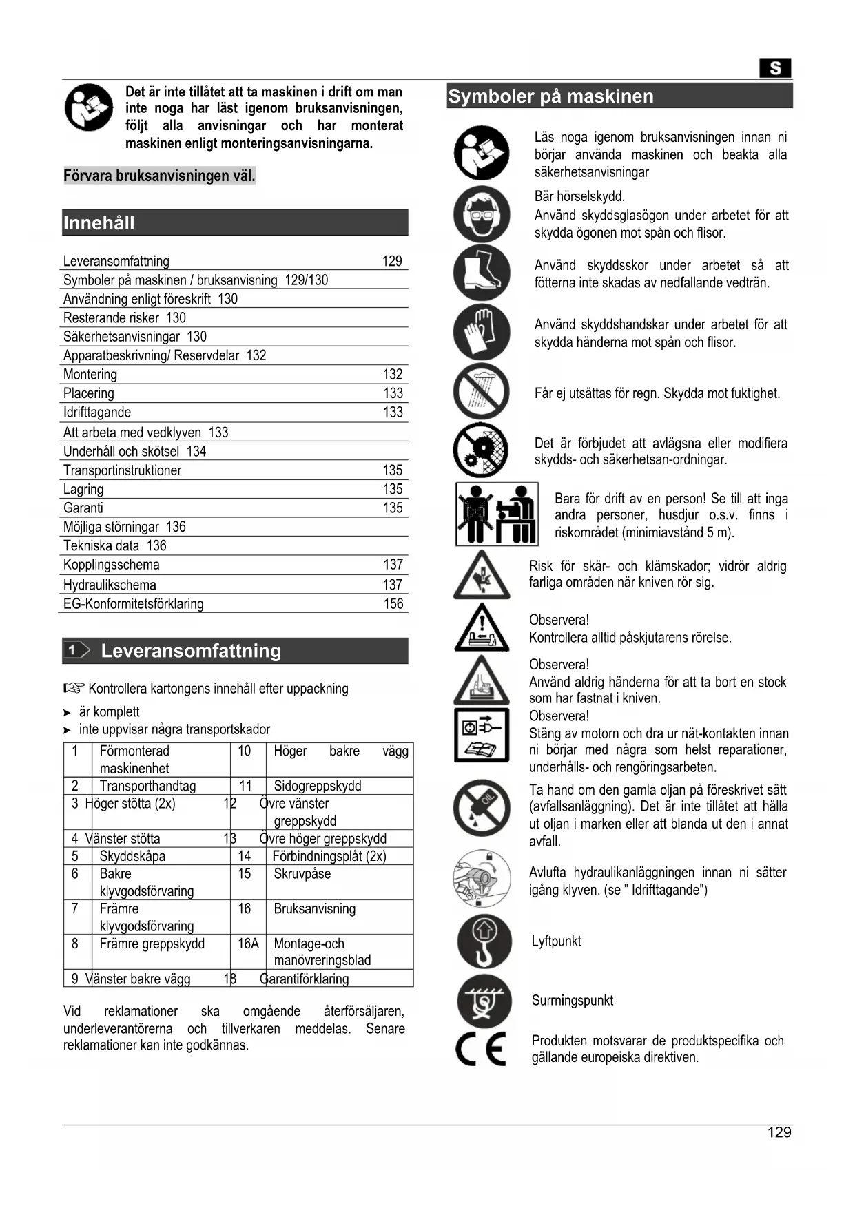 Innehåll Leveransomfattning 129 Symboler på maskinen / bruksanvisning 129/130 Användning enligt föreskrift 130 Resterande risker 130 Säkerhetsanvisningar 130 Apparatbeskrivning/ Reservdelar 132 Montering 132 Placering 133 Idrifttagande 133 Att arbeta med vedklyven 133 Underhåll och skötsel 134 Transportinstruktioner 135 Lagring 135 Garanti 135 Möjliga störningar 136 Tekniska data 136 Kopplingsschema 137 Hydraulikschema 137 EG-Konformitetsförklaring 156