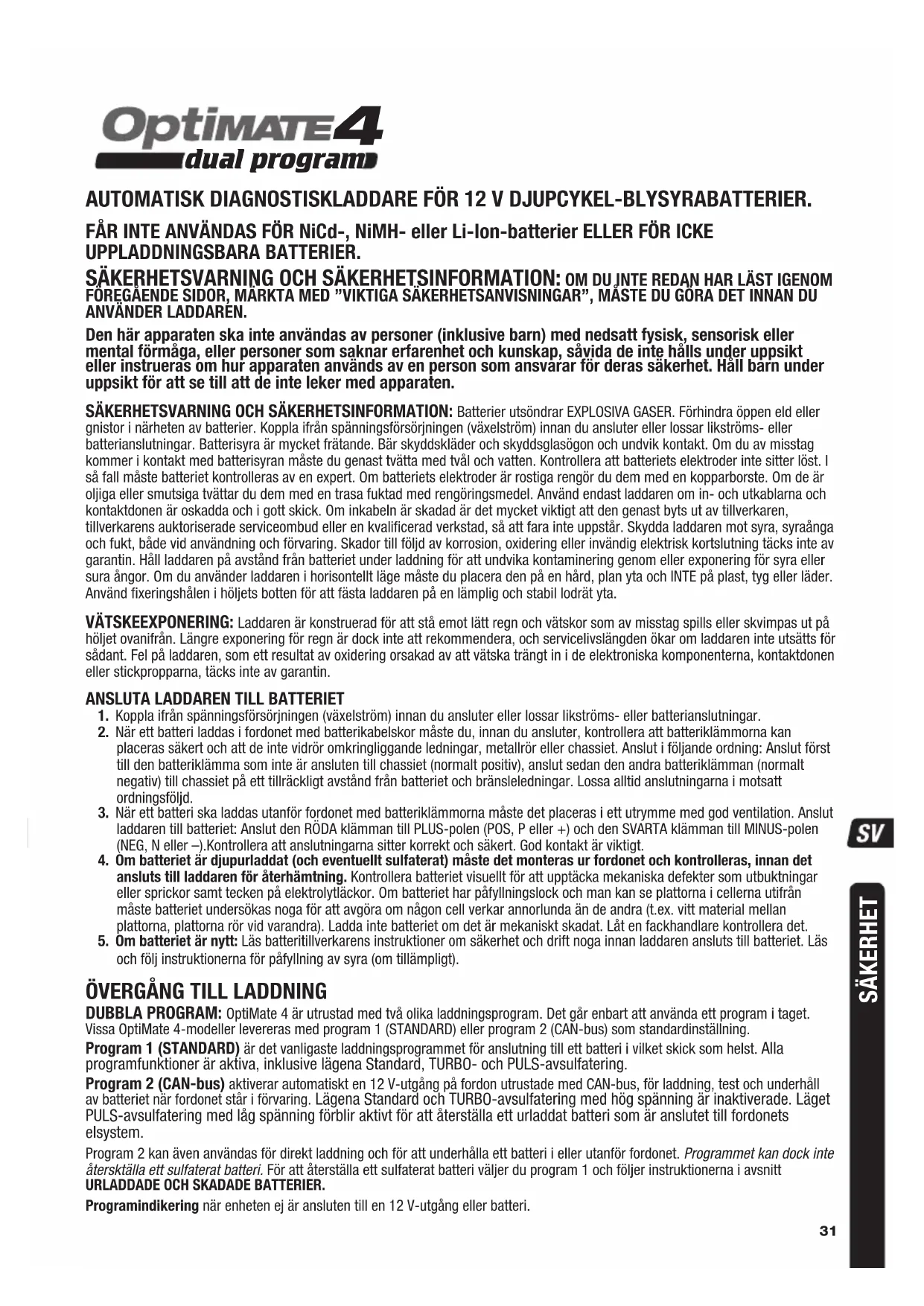 dual program AUTOMATISK DIAGNOSTISKLADDARE FÖR 12 V DJUPCYKEL-BLYSYRABATTERIER. FÅR INTE ANVÄNDAS FÖR NiCd-, NiMH- eller Li-Ion-batterier ELLER FÖR ICKE UPPLADDNINGSBARA BATTERIER. SÄKERHETSVARNING OCH SÄKERHETSINFORMATION: OM DU INTE REDAN HAR LÄST IGENOM FÖREGÅENDE SIDOR, MÄRKTA MED ”VIKTIGA SÄKERHETSANVISNINGAR”, MÅSTE DU GÖRA DET INNAN DU ANVÄNDER LADDAREN.Den här apparaten ska inte användas av personer (inklusive barn) med nedsatt fysisk, sensorisk eller mental förmåga, eller personer som saknar erfarenhet och kunskap, såvida de inte hålls under uppsikt eller instrueras om hur apparaten används av en person som ansvarar för deras säkerhet. Håll barn under uppsikt för att se till att de inte leker med apparaten. SÄKERHETSVARNING OCH SÄKERHETSINFORMATION: Batterier utsöndrar EXPLOSIVA GASER. Förhindra öppen eld eller gnistor i närheten av batterier. Koppla ifrån spänningsförsörjningen (växelström) innan du ansluter eller lossar likströms- eller batterianslutningar. Batterisyra är mycket frätande. Bär skyddskläder och skyddsglasögon och undvik kontakt. Om du av misstag kommer i kontakt med batterisyran måste du genast tvätta med tvål och vatten. Kontrollera att batteriets elektroder inte sitter löst. I så fall måste batteriet kontrolleras av en expert. Om batteriets elektroder är rostiga rengör du dem med en kopparborste. Om de är oljiga eller smutsiga tvättar du dem med en trasa fuktad med rengöringsmedel. Använd endast laddaren om in- och utkablarna och kontaktdonen är oskadda och i gott skick. Om inkabeln är skadad är det mycket viktigt att den genast byts ut av tillverkaren, tillverkarens auktoriserade serviceombud eller en kvalificerad verkstad, så att fara inte uppstår. Skydda laddaren mot syra, syraånga och fukt, både vid användning och förvaring. Skador till följd av korrosion, oxidering eller invändig elektrisk kortslutning täcks inte av garantin. Håll laddaren på avstånd från batteriet under laddning för att undvika kontaminering genom eller exponering för syra eller sura ångor. Om du använder laddaren i horisontellt läge måste du placera den på en hård, plan yta och INTE på plast, tyg eller läder. Använd fixeringshålen i höljets botten för att fästa laddaren på en lämplig och stabil lodrät yta. VÄTSKEEXPONERING: Laddaren är konstruerad för att stå emot lätt regn och vätskor som av misstag spills eller skvimpas ut på höljet ovanifrån. Längre exponering för regn är dock inte att rekommendera, och servicelivslängden ökar om laddaren inte utsätts för sådant. Fel på laddaren, som ett resultat av oxidering orsakad av att vätska trängt in i de elektroniska komponenterna, kontaktdonen eller stickpropparna, täcks inte av garantin.ANSLUTA LADDAREN TILL BATTERIET