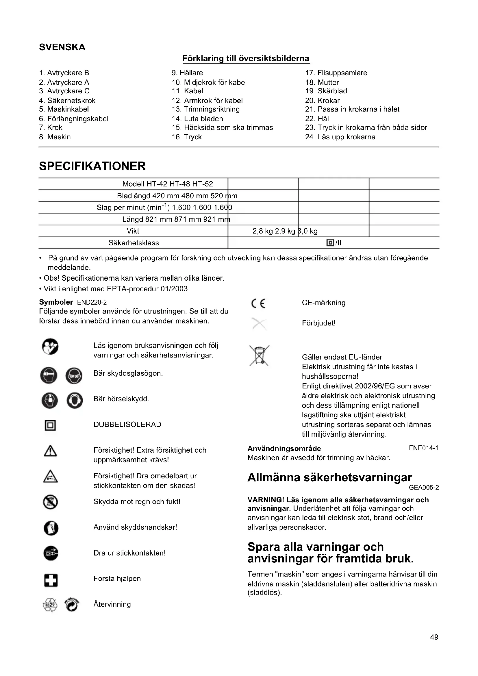 - Vikt i enlighet med EPTA-procedur 01/2003 Symboler END220-2 Följande symboler används för utrustningen. Se till att du förstår dess innebörd innan du använder maskinen. Läs igenom bruksanvisningen och följ varningar och säkerhetsanvisningar. Bär skyddsglasögon. Bär hörselskydd. DUBBELISOLERAD Försiktighet! Extra försiktighet och uppmärksamhet krävs! Försiktighet! Dra omedelbart ur stickkontakten om den skadas! Skydda mot regn och fukt! Använd skyddshandskar! Dra ur stickkontakten! Första hjälpen Återvinning CE-märkning Förbjudet! Gäller endast EU-länder Elektrisk utrustning får inte kastas i hushållssoporna! Enligt direktivet 2002/96/EG som avser äldre elektrisk och elektronisk utrustning och dess tillämpning enligt nationell lagstiftning ska uttjänt elektriskt utrustning sorteras separat och lämnas till miljövänlig återvinning. Användningsområde ENE014-1 Maskinen är avsedd för trimning av häckar. Allmänna säkerhetsvarningar GEA005-2 VARNING! Läs igenom alla säkerhetsvarningar och anvisningar. Underlåtenhet att följa varningar och anvisningar kan leda till elektrisk stöt, brand och/eller allvarliga personskador. Spara alla varningar och anvisningar för framtida bruk. Termen "maskin" som anges i varningarna hänvisar till din eldrivna maskin (sladdansluten) eller batteridrivna maskin (sladdlös).