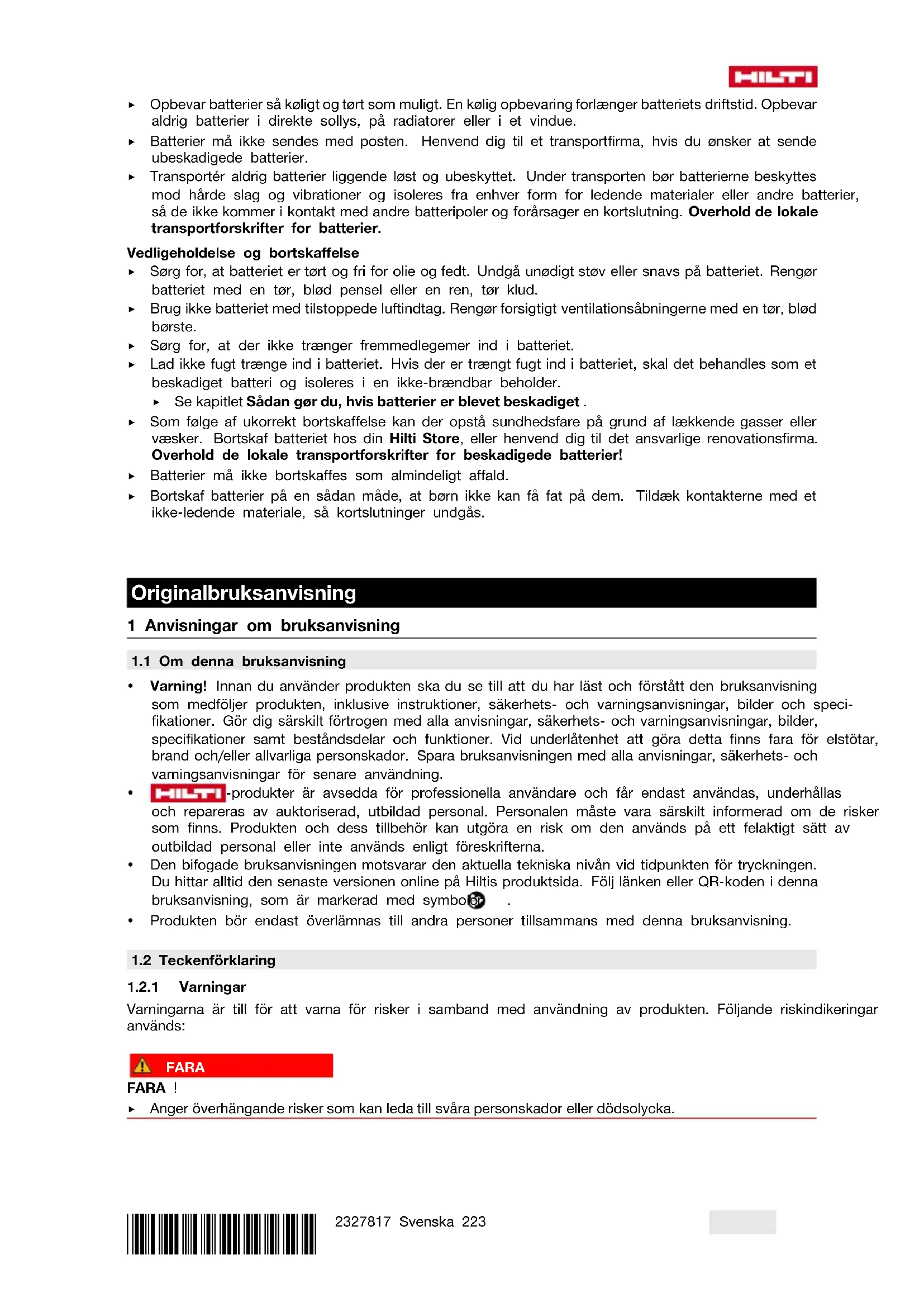 Läs säkerhetsanvisningarna för användning av Hilti litiumjonbatterier som du hittar genom att skanna QR-koden i slutet av denna bruksanvisning.