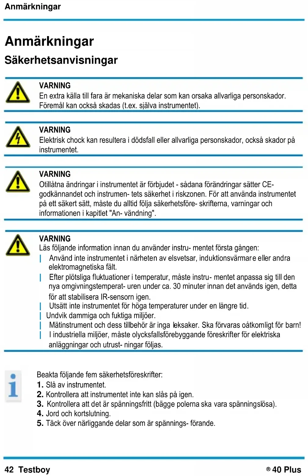 VARNING Läs följande information innan du använder instru- mentet första gången: | Använd inte instrumentet i närheten av elsvetsar, induktionsvärmare eller andra elektromagnetiska fält. | Efter plötsliga fluktuationer i temperatur, måste instru- mentet anpassa sig till den nya omgivningstemperat- uren under ca. 30 minuter innan det används igen, detta för att stabilisera IR-sensorn igen. | Utsätt inte instrumentet för höga temperaturer under en längre tid. | Undvik dammiga och fuktiga miljöer. | Mätinstrument och dess tillbehör är inga leksaker. Ska förvaras oåtkomligt för barn! | I industriella miljöer, måste olycksfallsförebyggande föreskrifter för elektriska anläggningar och utrust- ningar följas.