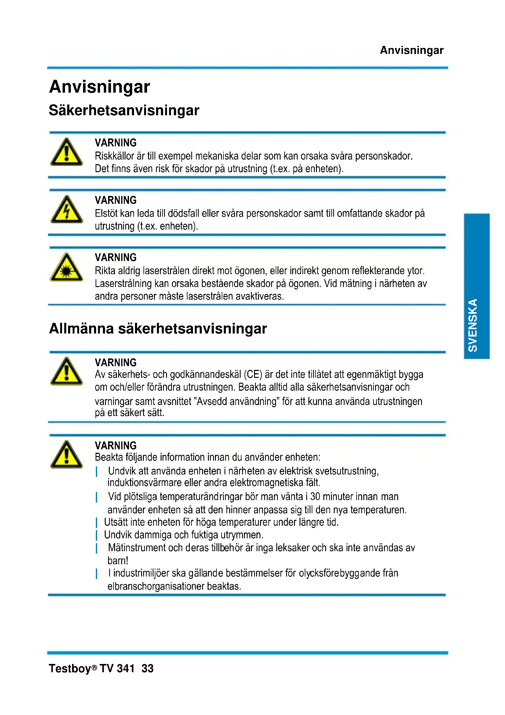 VARNING Beakta följande information innan du använder enheten: | Undvik att använda enheten i närheten av elektrisk svetsutrustning, induktionsvärmare eller andra elektromagnetiska fält. | Vid plötsliga temperaturändringar bör man vänta i 30 minuter innan man använder enheten så att den hinner anpassa sig till den nya temperaturen. | Utsätt inte enheten för höga temperaturer under längre tid. | Undvik dammiga och fuktiga utrymmen. | Mätinstrument och deras tillbehör är inga leksaker och ska inte användas av barn! | I industrimiljöer ska gällande bestämmelser för olycksförebyggande från elbranschorganisationer beaktas.Anvisningar 34 Testboy