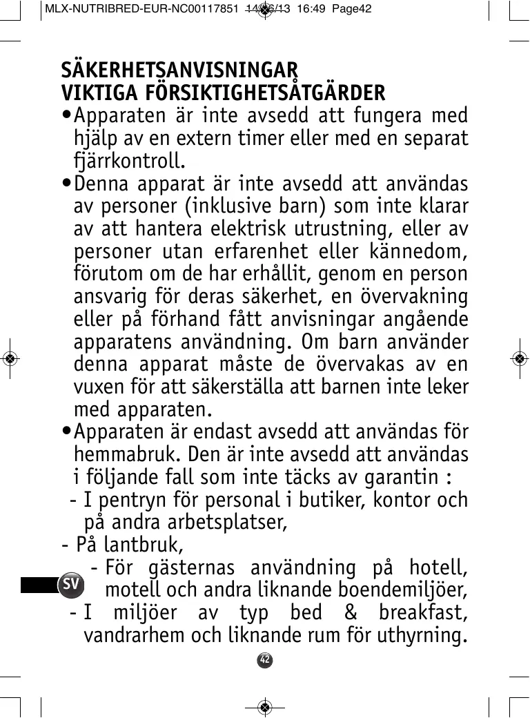 SÄKERHETSANVISNINGAR VIKTIGA FÖRSIKTIGHETSÅTGÄRDER •Apparaten är inte avsedd att fungera med hjälp av en extern timer eller med en separat fjärrkontroll. •Denna apparat är inte avsedd att användas av personer (inklusive barn) som inte klarar av att hantera elektrisk utrustning, eller av personer utan erfarenhet eller kännedom, förutom om de har erhållit, genom en person ansvarig för deras säkerhet, en övervakning eller på förhand fått anvisningar angående apparatens användning. Om barn använder denna apparat måste de övervakas av en vuxen för att säkerställa att barnen inte leker med apparaten. •Apparaten är endast avsedd att användas för hemmabruk. Den är inte avsedd att användas i följande fall som inte täcks av garantin : - I pentryn för personal i butiker, kontor och på andra arbetsplatser, - På lantbruk, - För gästernas användning på hotell, SV motell och andra liknande boendemiljöer, - I miljöer av typ bed & breakfast, vandrarhem och liknande rum för uthyrning. 42