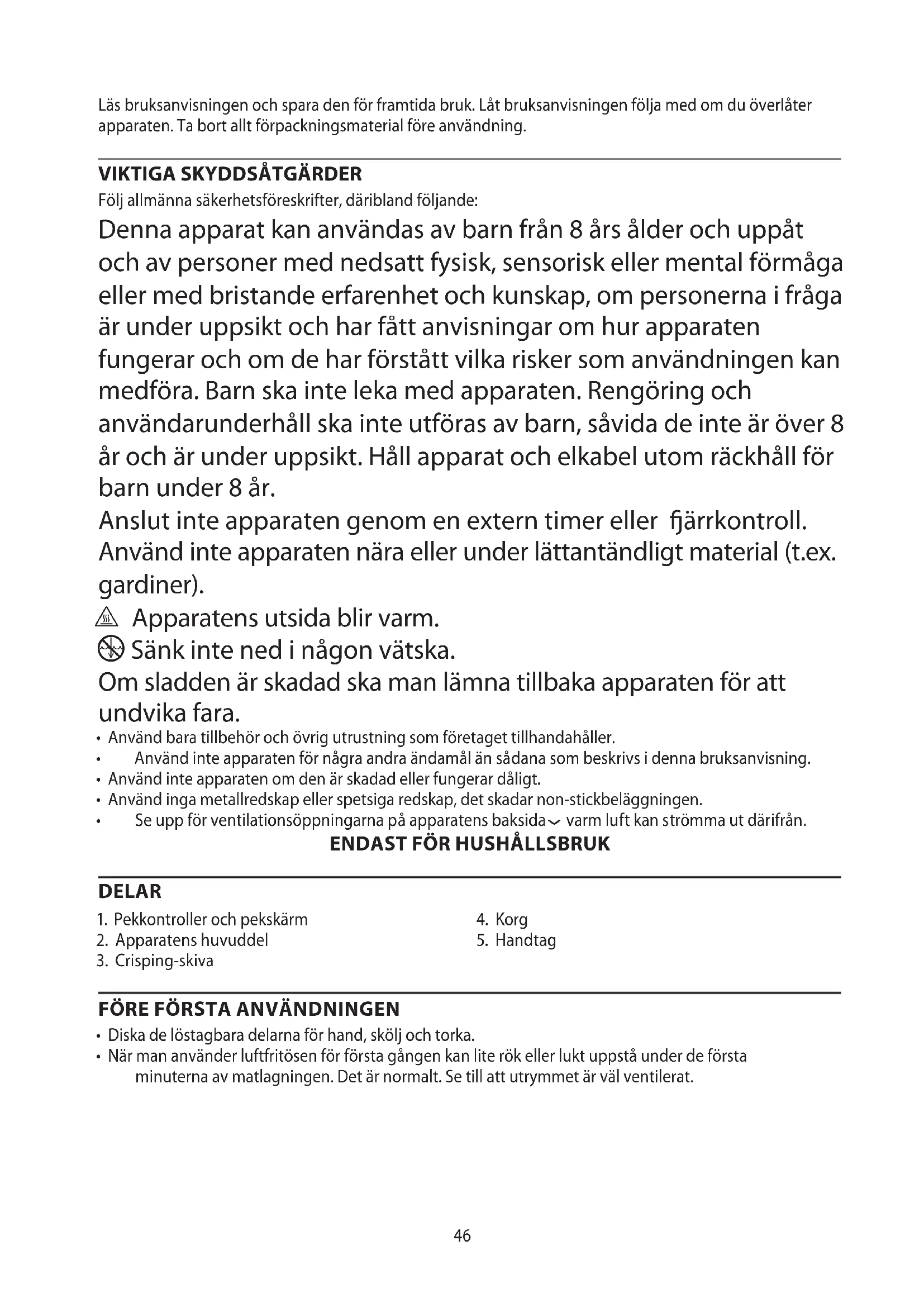 Följ allmänna säkerhetsföreskrifter, däribland följande: Denna apparat kan användas av barn från 8 års ålder och uppåt och av personer med nedsatt fysisk, sensorisk eller mental förmåga eller med bristande erfarenhet och kunskap, om personerna i fråga är under uppsikt och har fått anvisningar om hur apparaten fungerar och om de har förstått vilka risker som användningen kan medföra. Barn ska inte leka med apparaten. Rengöring och användarunderhåll ska inte utföras av barn, såvida de inte är över 8 år och är under uppsikt. Håll apparat och elkabel utom räckhåll för barn under 8 år. Anslut inte apparaten genom en extern timer eller ärrkontroll. Använd inte apparaten nära eller under lättantändligt material (t.ex. gardiner). ¬ Apparatens utsida blir varm. i Sänk inte ned i någon vätska. Om sladden är skadad ska man lämna tillbaka apparaten för att undvika fara.