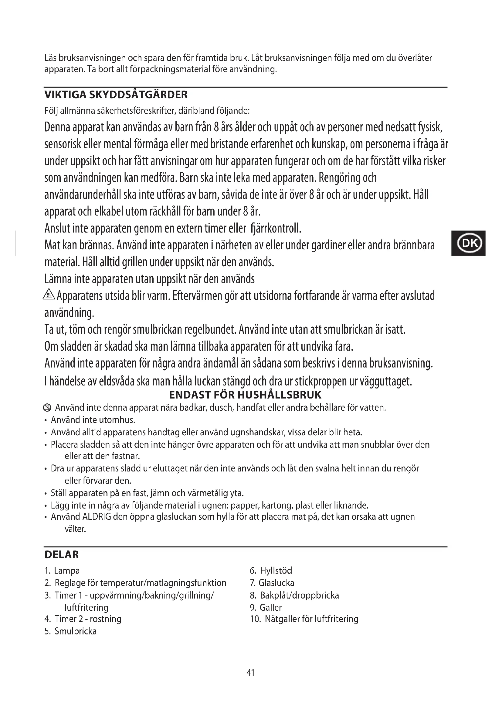 Följ allmänna säkerhetsföreskrifter, däribland följande: Denna apparat kan användas av barn från 8 års ålder och uppåt och av personer med nedsatt fysisk, sensorisk eller mental förmåga eller med bristande erfarenhet och kunskap, om personerna i fråga är under uppsikt och har fått anvisningar om hur apparaten fungerar och om de har förstått vilka risker som användningen kan medföra. Barn ska inte leka med apparaten. Rengöring och användarunderhåll ska inte utföras av barn, såvida de inte är över 8 år och är under uppsikt. Håll apparat och elkabel utom räckhåll för barn under 8 år. Anslut inte apparaten genom en extern timer eller ärrkontroll. Mat kan brännas. Använd inte apparaten i närheten av eller under gardiner eller andra brännbara material. Håll alltid grillen under uppsikt när den används. Lämna inte apparaten utan uppsikt när den används