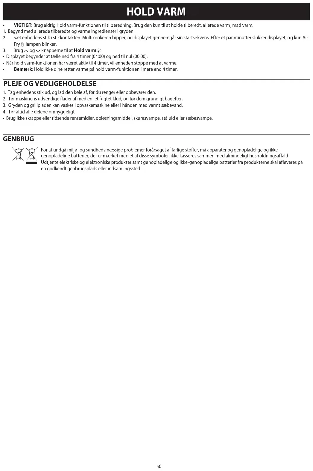 - Obs: Lämna inte livsmedel på varmhållningsfunktionen i mer än 4 timmar.