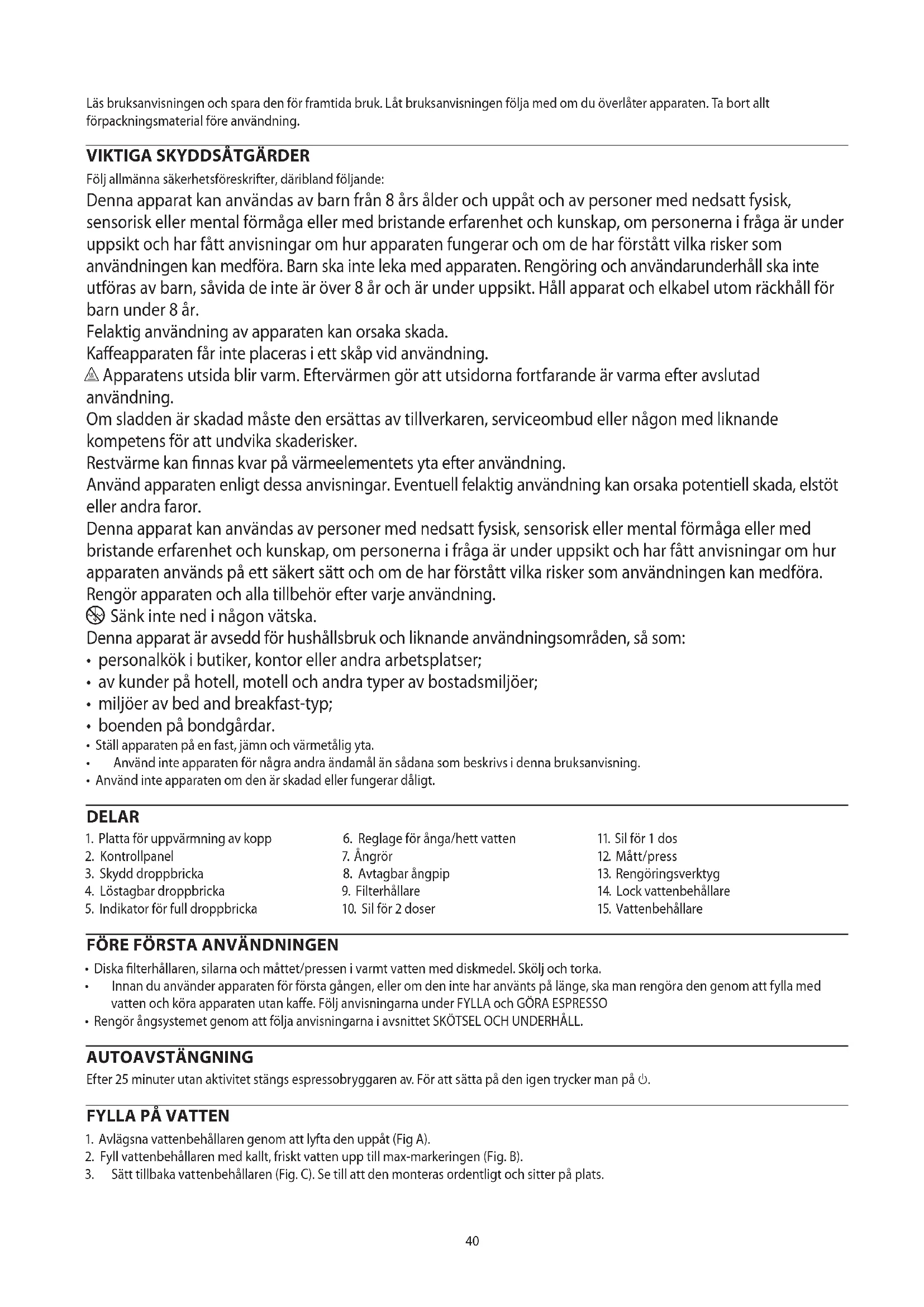 Följ allmänna säkerhetsföreskrifter, däribland följande: Denna apparat kan användas av barn från 8 års ålder och uppåt och av personer med nedsatt fysisk, sensorisk eller mental förmåga eller med bristande erfarenhet och kunskap, om personerna i fråga är under uppsikt och har fått anvisningar om hur apparaten fungerar och om de har förstått vilka risker som användningen kan medföra. Barn ska inte leka med apparaten. Rengöring och användarunderhåll ska inte utföras av barn, såvida de inte är över 8 år och är under uppsikt. Håll apparat och elkabel utom räckhåll för barn under 8 år. Felaktig användning av apparaten kan orsaka skada. Kaffeapparaten får inte placeras i ett skåp vid användning. h Apparatens utsida blir varm. Eftervärmen gör att utsidorna fortfarande är varma efter avslutad användning. Om sladden är skadad måste den ersättas av tillverkaren, serviceombud eller någon med liknande kompetens för att undvika skaderisker. Restvärme kan finnas kvar på värmeelementets yta efter användning. Använd apparaten enligt dessa anvisningar. Eventuell felaktig användning kan orsaka potentiell skada, elstöt eller andra faror. Denna apparat kan användas av personer med nedsatt fysisk, sensorisk eller mental förmåga eller med bristande erfarenhet och kunskap, om personerna i fråga är under uppsikt och har fått anvisningar om hur apparaten används på ett säkert sätt och om de har förstått vilka risker som användningen kan medföra. Rengör apparaten och alla tillbehör efter varje användning.