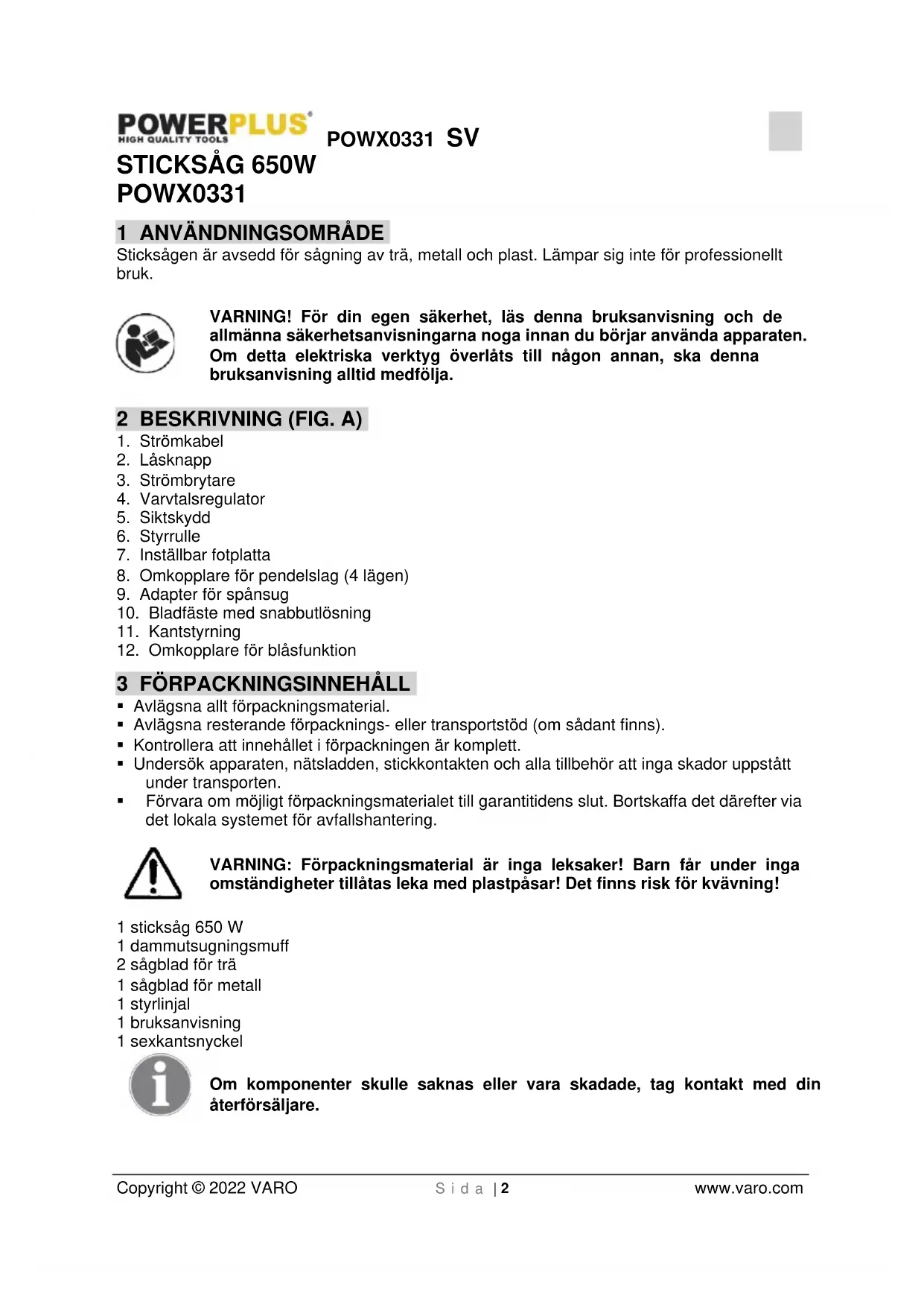 - Låt endast kvalificerat fackfolk reparera verktyget med användande av originalreservdelar. Detta för att garantera att verktygets säkerhet vidmakthålls. 6 SÄRSKILDA SÄKERHETSANVISNINGAR FÖR STICKSÅGAR OBS! Användningen av andra tillbehör eller annan extra utrustning än vad som rekommenderas i denna användarmanual eller som medföljer vid leveransen kan medföra risk för personskador.POWX0331 SV Copyright © 2022 VARO S i d a | 5 www.varo.com