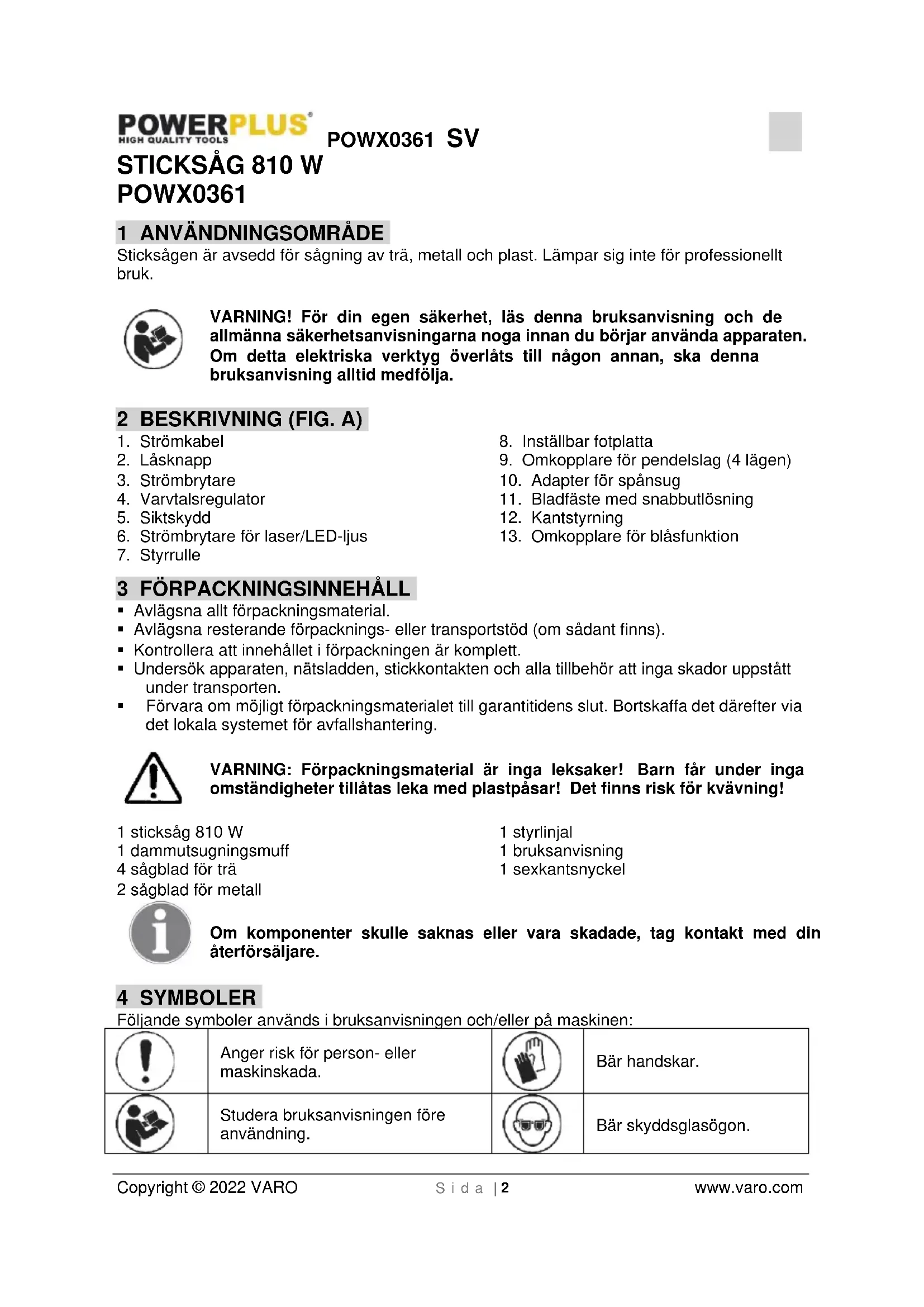 - Låt endast kvalificerat fackfolk reparera verktyget med användande av originalreservdelar. Detta för att garantera att verktygets säkerhet vidmakthålls.POWX0361 SV Copyright © 2022 VARO S i d a | 5 www.varo.com