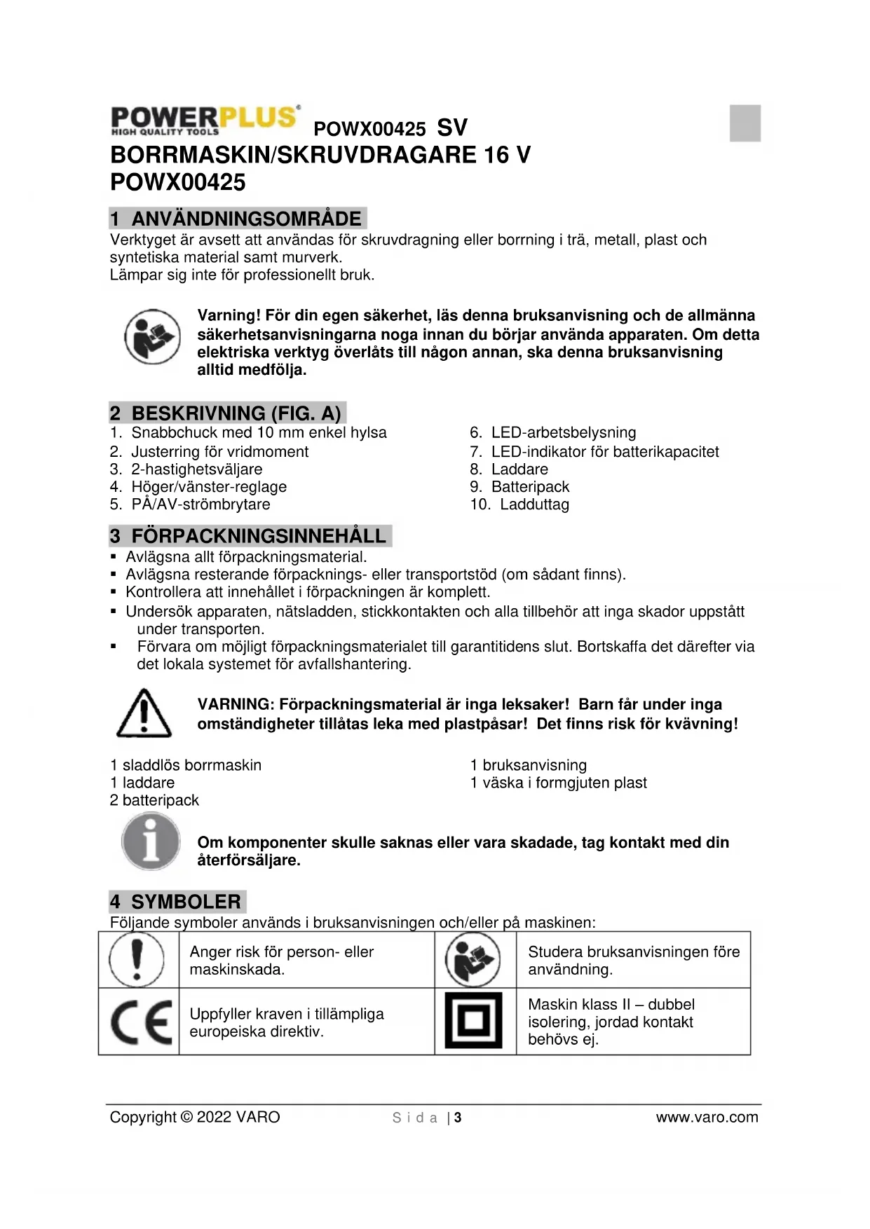 - Låt endast kvalificerat fackfolk reparera verktyget med användande av originalreservdelar. Detta för att garantera att verktygets säkerhetsstandards vidmakthålls.POWX00425 SV Copyright © 2022 VARO S i d a | 6 www.varo.com 6 EXTRA SÄKERHETSINSTRUKTIONER FÖR BATTERIER OCH LADDARE