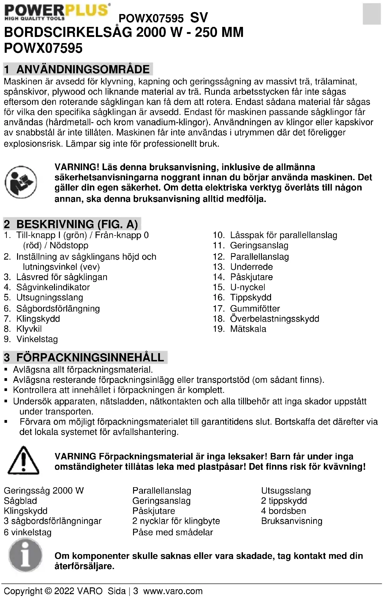 - Förvara om möjligt förpackningsmaterialet till garantitidens slut. Bortskaffa det därefter via det lokala systemet för avfallshantering. VARNING Förpackningsmaterial är inga leksaker! Barn får under inga omständigheter tillåtas leka med plastpåsar! Det finns risk för kvävning! Geringssåg 2000 W Sågblad Klingskydd 3 sågbordsförlängningar 6 vinkelstag Parallellanslag Geringsanslag Påskjutare 2 nycklar för klingbyte Påse med smådelar Utsugsslang 2 tippskydd 4 bordsben Bruksanvisning Om komponenter skulle saknas eller vara skadade, tag kontakt med din återförsäljare.POWX07595 SV Copyright © 2022 VARO Sida | 4 www.varo.com
