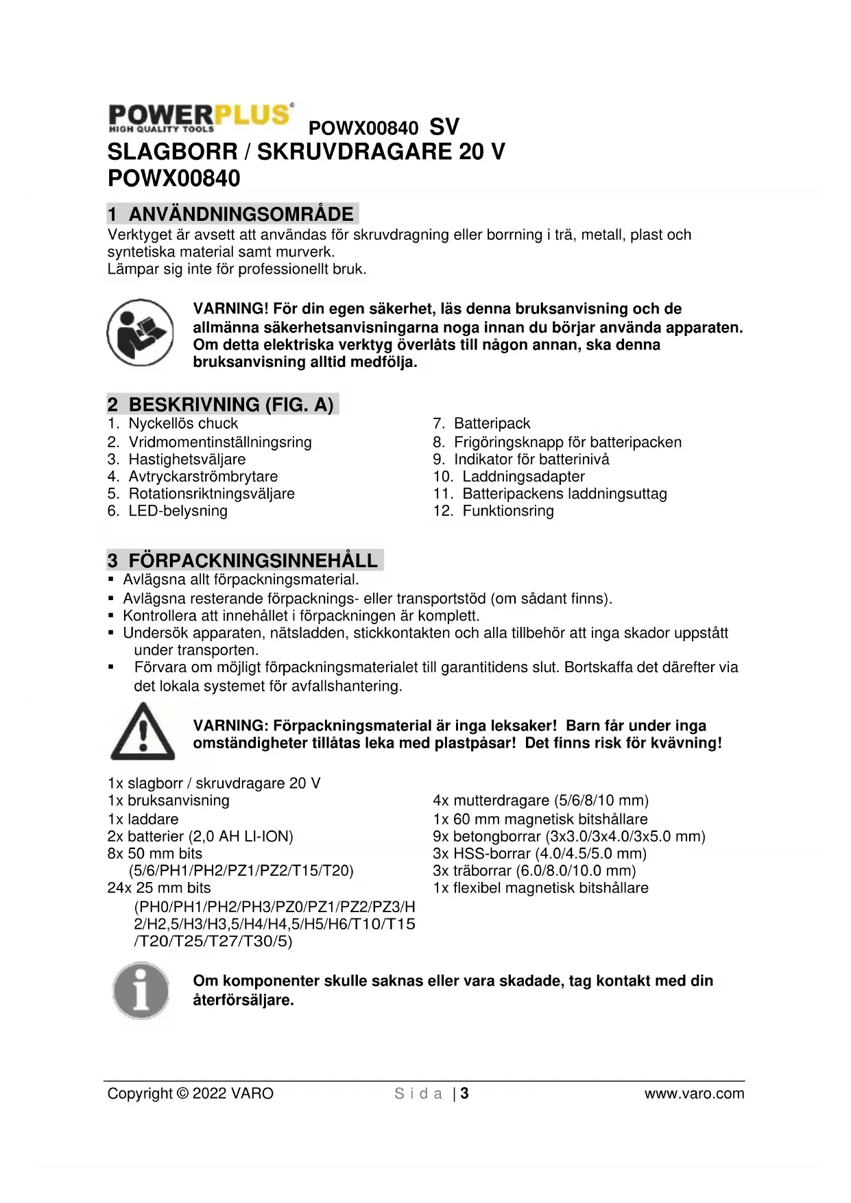 - Förvara om möjligt förpackningsmaterialet till garantitidens slut. Bortskaffa det därefter via det lokala systemet för avfallshantering. VARNING: Förpackningsmaterial är inga leksaker! Barn får under inga omständigheter tillåtas leka med plastpåsar! Det finns risk för kvävning! 1x slagborr / skruvdragare 20 V 1x bruksanvisning 1x laddare 2x batterier (2,0 AH LI-ION) 8x 50 mm bits (5/6/PH1/PH2/PZ1/PZ2/T15/T20) 24x 25 mm bits (PH0/PH1/PH2/PH3/PZ0/PZ1/PZ2/PZ3/H 2/H2,5/H3/H3,5/H4/H4,5/H5/H6/ T10/T15 /T20/T25/T27/T30/5) 4x mutterdragare (5/6/8/10 mm) 1x 60 mm magnetisk bitshållare 9x betongborrar (3x3.0/3x4.0/3x5.0 mm) 3x HSS-borrar (4.0/4.5/5.0 mm) 3x träborrar (6.0/8.0/10.0 mm) 1x flexibel magnetisk bitshållare Om komponenter skulle saknas eller vara skadade, tag kontakt med din återförsäljare.POWX00840 SV Copyright © 2022 VARO S i d a | 4 www.varo.com 4 SYMBOLER Följande symboler används i bruksanvisningen och/eller på maskinen: