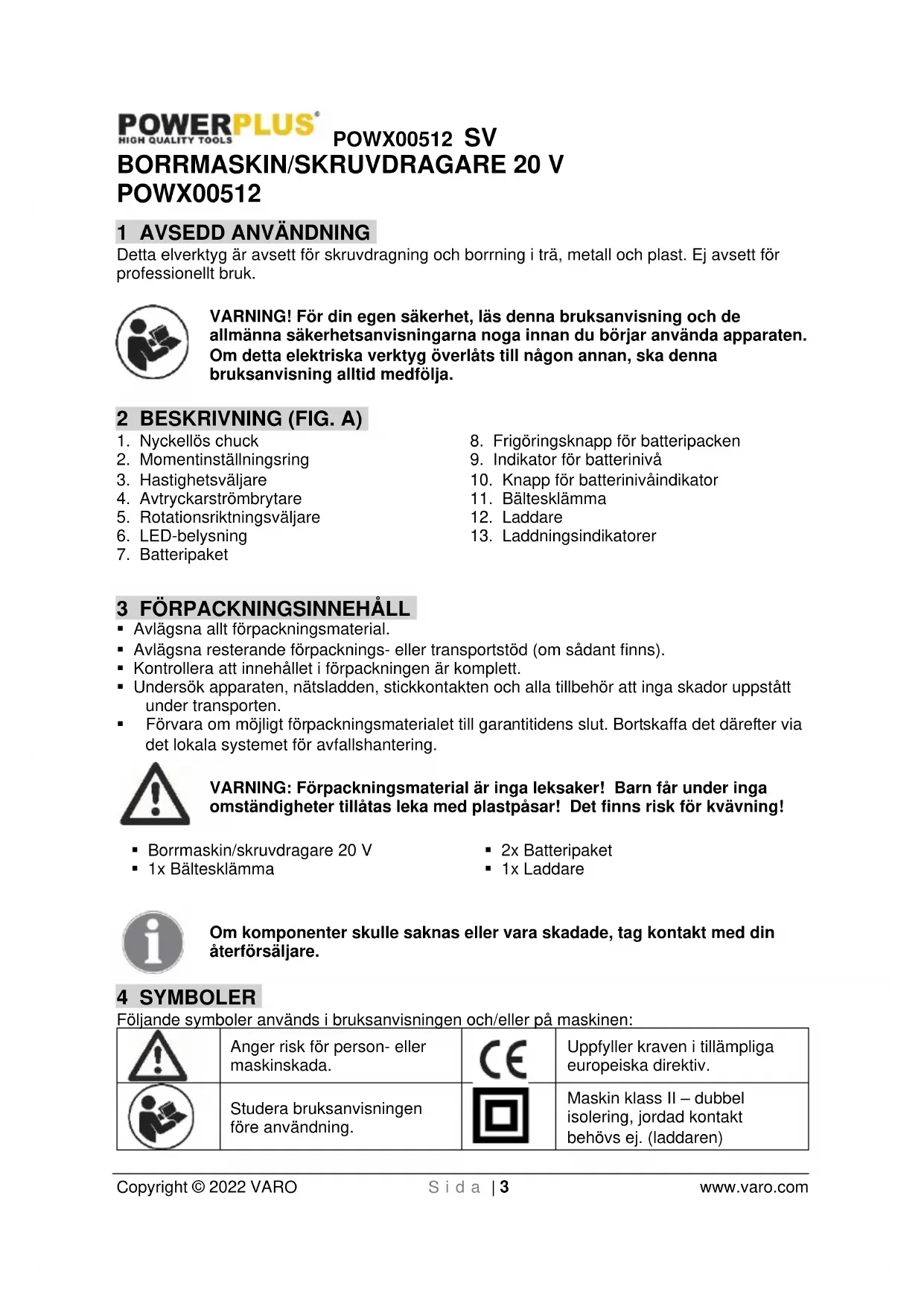 - Varningar, försiktighetsåtgärder och instruktioner som tas upp i denna bruksanvisning omfattar inte alla möjliga förhållanden och situationer som kan uppstå. Användaren ska vara införstådd med att sunt förnuft och varsamhet är faktorer som inte kan byggas in i produkten, utan är något som användaren måste stå för. 7 EXTRA SÄKERHETSFÖRESKRIFTER FÖR BATTERIER OCH LADDARE Använd endast batterier och laddare som är avsedda för den här apparaten.POWX00512 SV Copyright © 2022 VARO S i d a | 7 www.varo.com