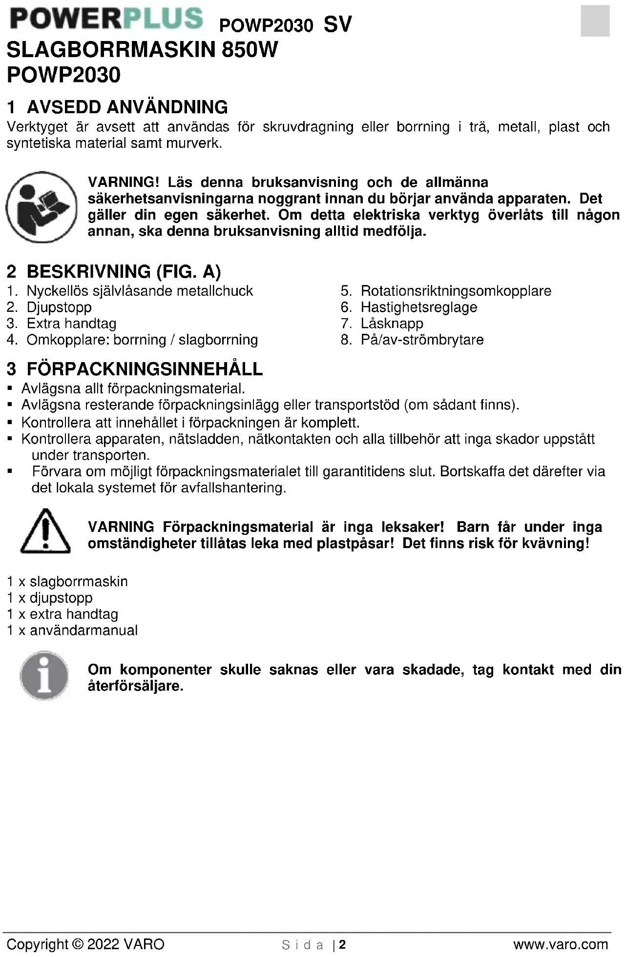 - Använd det elektriska verktyget, dess tillbehör och arbetsverktyg, i överensstämmelse med dessa anvisningar och på det sätt som avsetts med denna speciella typ av verktyg, med beaktande av arbetsförhållandena och det arbete som ska utföras. Användningen av elektriska verktyg för andra ändamål än de de är avsedda för kan leda till olyckstillbud.POWP2030 SV Copyright © 2022 VARO S i d a | 5 www.varo.com