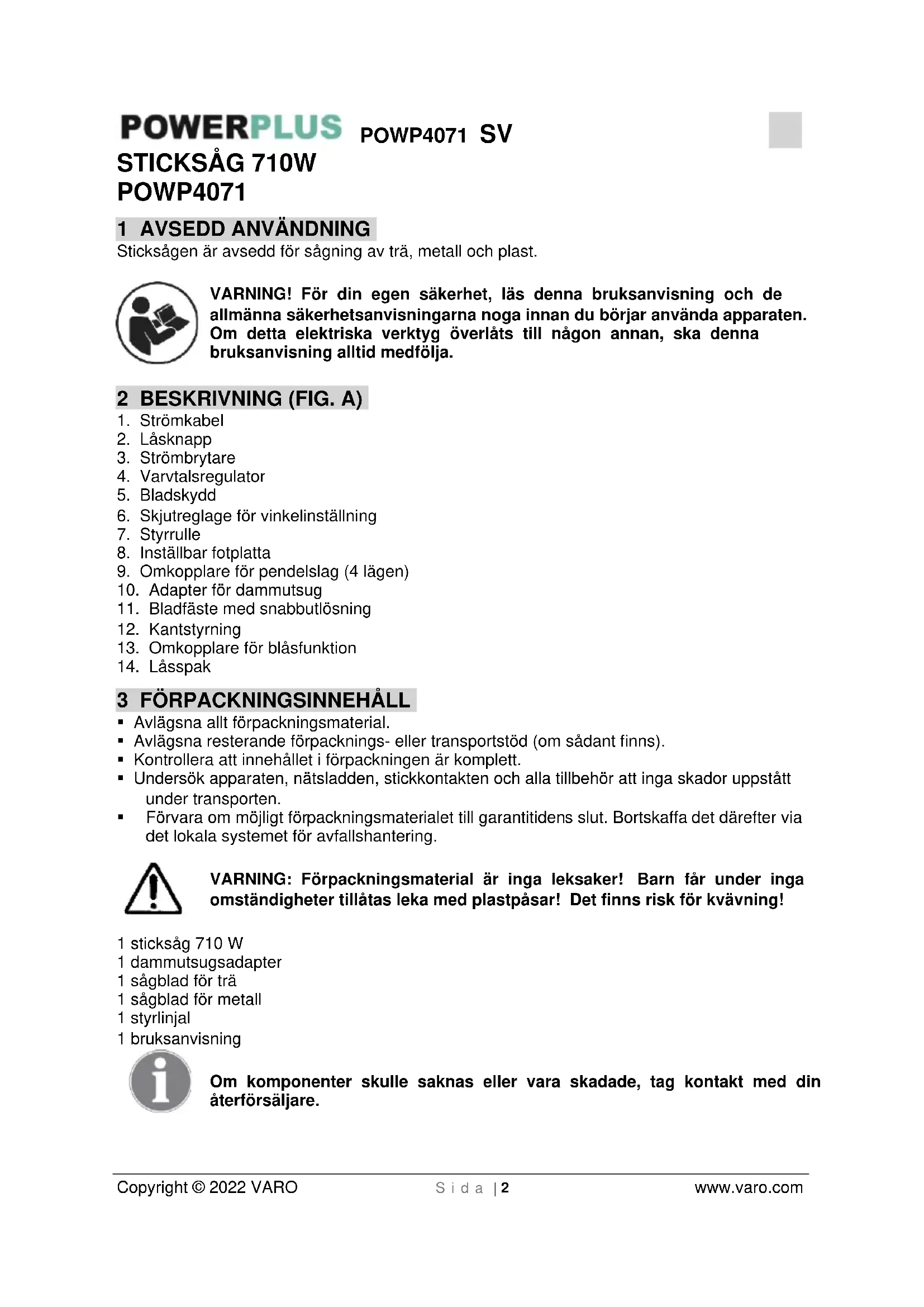 - Förvara om möjligt förpackningsmaterialet till garantitidens slut. Bortskaffa det därefter via det lokala systemet för avfallshantering. VARNING: Förpackningsmaterial är inga leksaker! Barn får under inga omständigheter tillåtas leka med plastpåsar! Det finns risk för kvävning! 1 sticksåg 710 W 1 dammutsugsadapter 1 sågblad för trä 1 sågblad för metall 1 styrlinjal 1 bruksanvisning Om komponenter skulle saknas eller vara skadade, tag kontakt med din återförsäljare.POWP4071 SV Copyright © 2022 VARO S i d a | 3 www.varo.com 4 SYMBOLER Följande symboler används i bruksanvisningen och/eller på maskinen:
