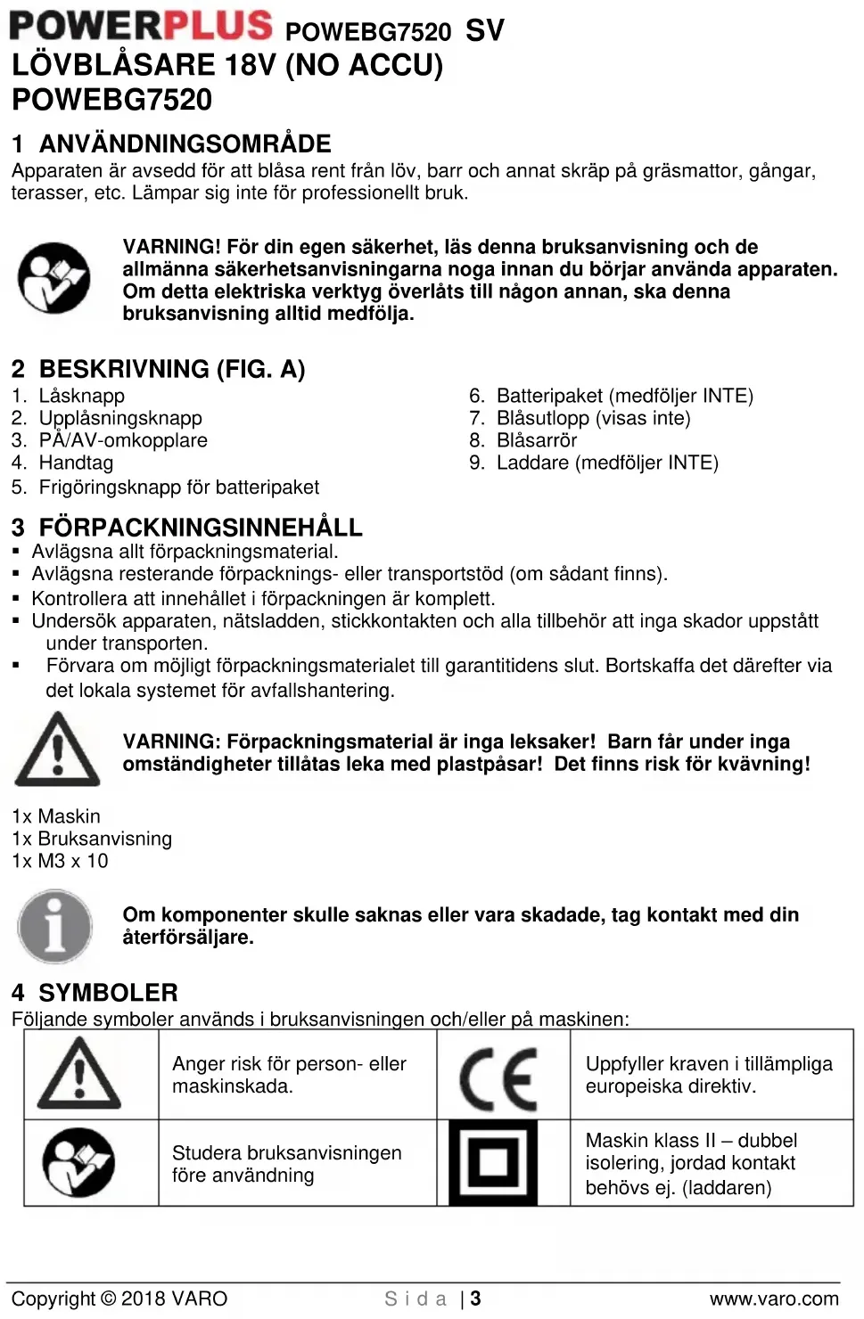 - Låt endast kvalificerat fackfolk reparera verktyget med användande av originalreservdelar. Detta för att garantera att verktygets säkerhetsstandards vidmakthålls.POWEBG7520 SV Copyright © 2018 VARO S i d a | 6 www.varo.com 6 SÄKERHETSVARNING FÖR LÖVBLÅSARE