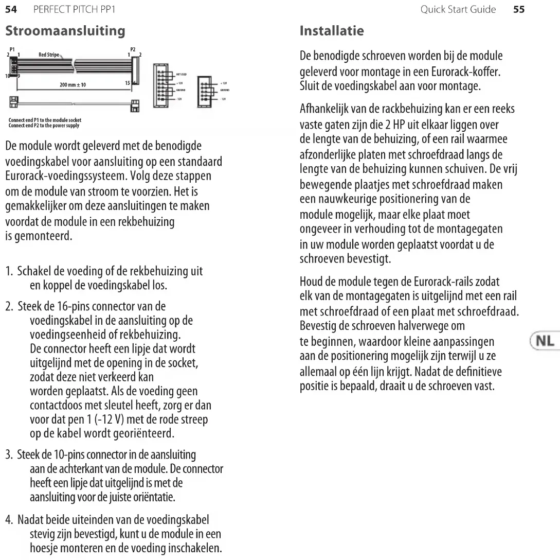 - Var försiktig vid inställning av GATE-kontrollen så att oönskade artefakter såsom ngerrörelser eller brus i mikrofonen inte resulterar i att oönskade gates skapas.61Quick Start Guide60 PERFECT PITCH PP1 Strömanslutning Modulen levereras med den strömkabel som krävs för att ansluta till ett vanligt Eurorack-nätaggregat. Följ dessa steg för att ansluta ström till modulen. Det är lättare att göra dessa anslutningar innan modulen har monterats i ett rackfodral.