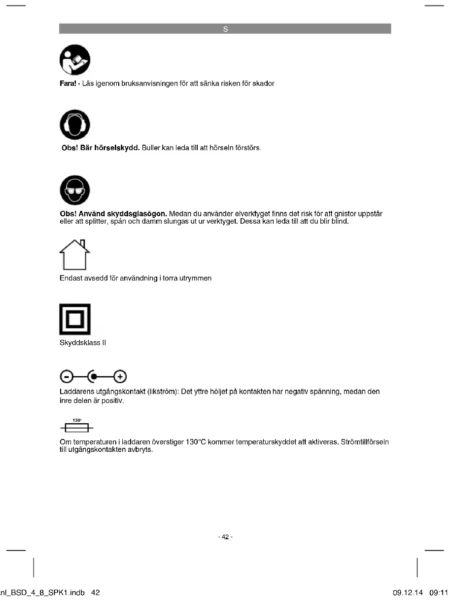 Fara! - Läs igenom bruksanvisningen för att sänka risken för skador Obs! Bär hörselskydd. Buller kan leda till att hörseln förstörs. Obs! Använd skyddsglasögon. Medan du använder elverktyget fi nns det risk för att gnistor uppstår eller att splitter, spån och damm slungas ut ur verktyget. Dessa kan leda till att du blir blind. Endast avsedd för användning i torra utrymmen Skyddsklass II Laddarens utgångskontakt (likström): Det yttre höljet på kontakten har negativ spänning, medan den inre delen är positiv. 130° Om temperaturen i laddaren överstiger 130°C kommer temperaturskyddet att aktiveras. Strömtillförseln till utgångskontakten avbryts. Anl_BSD_4_8_SPK1.indb 42Anl_BSD_4_8_SPK1.indb 42 09.12.14 09:1109.12.14 09:11S