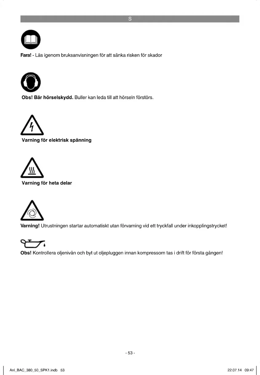 Obs! Bär hörselskydd. Buller kan leda till att hörseln förstörs. Fara! - Läs igenom bruksanvisningen för att sänka risken för skador Varning för elektrisk spänning Varning för heta delar Varning! Utrustningen startar automatiskt utan förvarning vid ett tryckfall under inkopplingstrycket! Obs! Kontrollera oljenivån och byt ut oljepluggen innan kompressorn tas i drift för första gången! Anl_BAC_380_50_SPK1.indb 53Anl_BAC_380_50_SPK1.indb 53 22.07.14 09:4722.07.14 09:47S