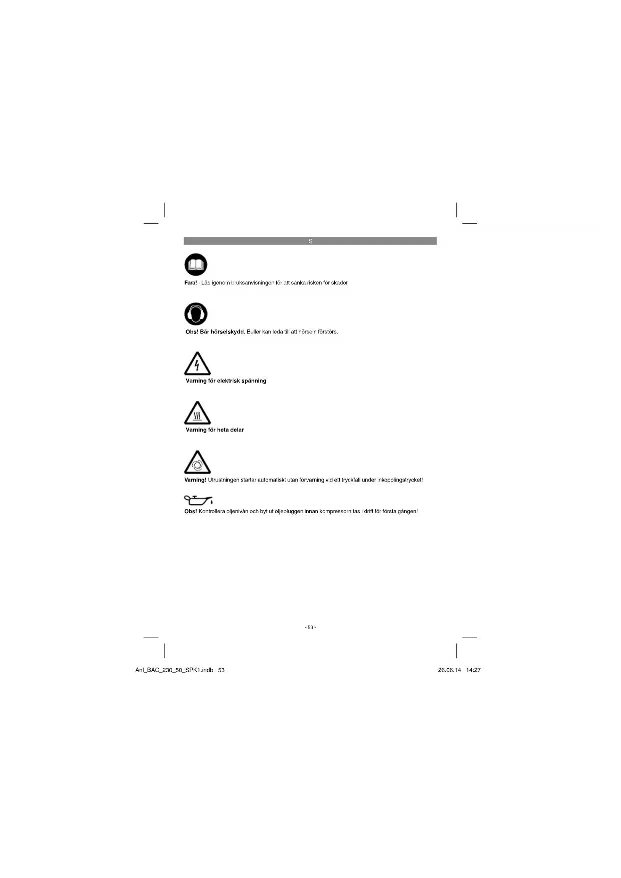Obs! Bär hörselskydd. Buller kan leda till att hörseln förstörs. Fara! - Läs igenom bruksanvisningen för att sänka risken för skador Varning för elektrisk spänning Varning för heta delar Varning! Utrustningen startar automatiskt utan förvarning vid ett tryckfall under inkopplingstrycket! Obs! Kontrollera oljenivån och byt ut oljepluggen innan kompressorn tas i drift för första gången! Anl_BAC_230_50_SPK1.indb 53Anl_BAC_230_50_SPK1.indb 53 26.06.14 14:2726.06.14 14:27S