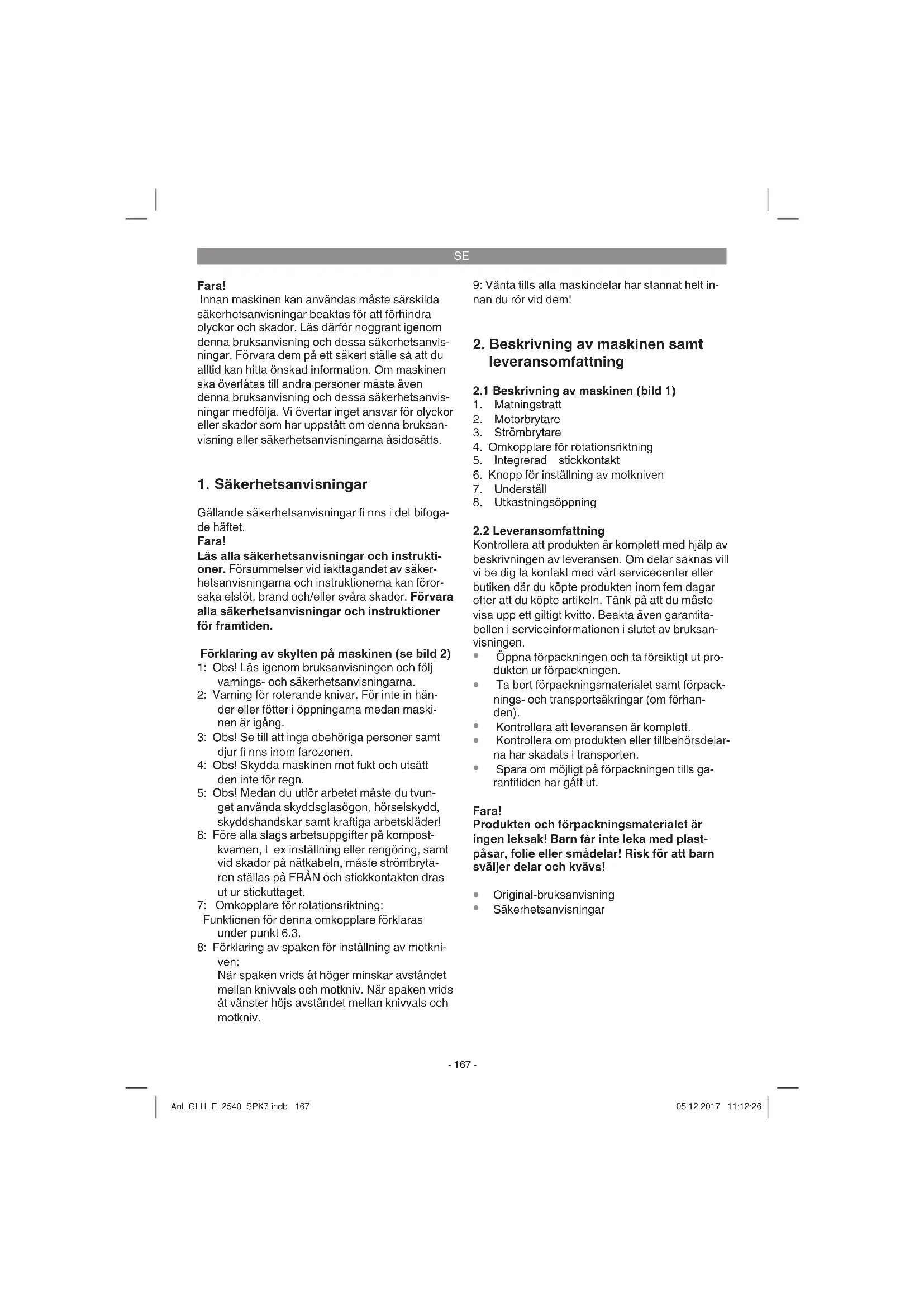 Gällande säkerhetsanvisningar fi nns i det bifoga- de häftet. Fara! Läs alla säkerhetsanvisningar och instrukti- oner. Försummelser vid iakttagandet av säker- hetsanvisningarna och instruktionerna kan föror- saka elstöt, brand och/eller svåra skador. Förvara alla säkerhetsanvisningar och instruktioner för framtiden. Förklaring av skylten på maskinen (se bild 2) 1: Obs! Läs igenom bruksanvisningen och följ varnings- och säkerhetsanvisningarna. 2: Varning för roterande knivar. För inte in hän- der eller fötter i öppningarna medan maski- nen är igång. 3: Obs! Se till att inga obehöriga personer samt djur fi nns inom farozonen. 4: Obs! Skydda maskinen mot fukt och utsätt den inte för regn. 5: Obs! Medan du utför arbetet måste du tvun- get använda skyddsglasögon, hörselskydd, skyddshandskar samt kraftiga arbetskläder! 6: Före alla slags arbetsuppgifter på kompost- kvarnen, t ex inställning eller rengöring, samt vid skador på nätkabeln, måste strömbryta- ren ställas på FRÅN och stickkontakten dras ut ur stickuttaget. 7: Omkopplare för rotationsriktning: Funktionen för denna omkopplare förklaras under punkt 6.3. 8: Förklaring av spaken för inställning av motkni- ven: När spaken vrids åt höger minskar avståndet mellan knivvals och motkniv. När spaken vrids åt vänster höjs avståndet mellan knivvals och motkniv. 9: Vänta tills alla maskindelar har stannat helt in- nan du rör vid dem!