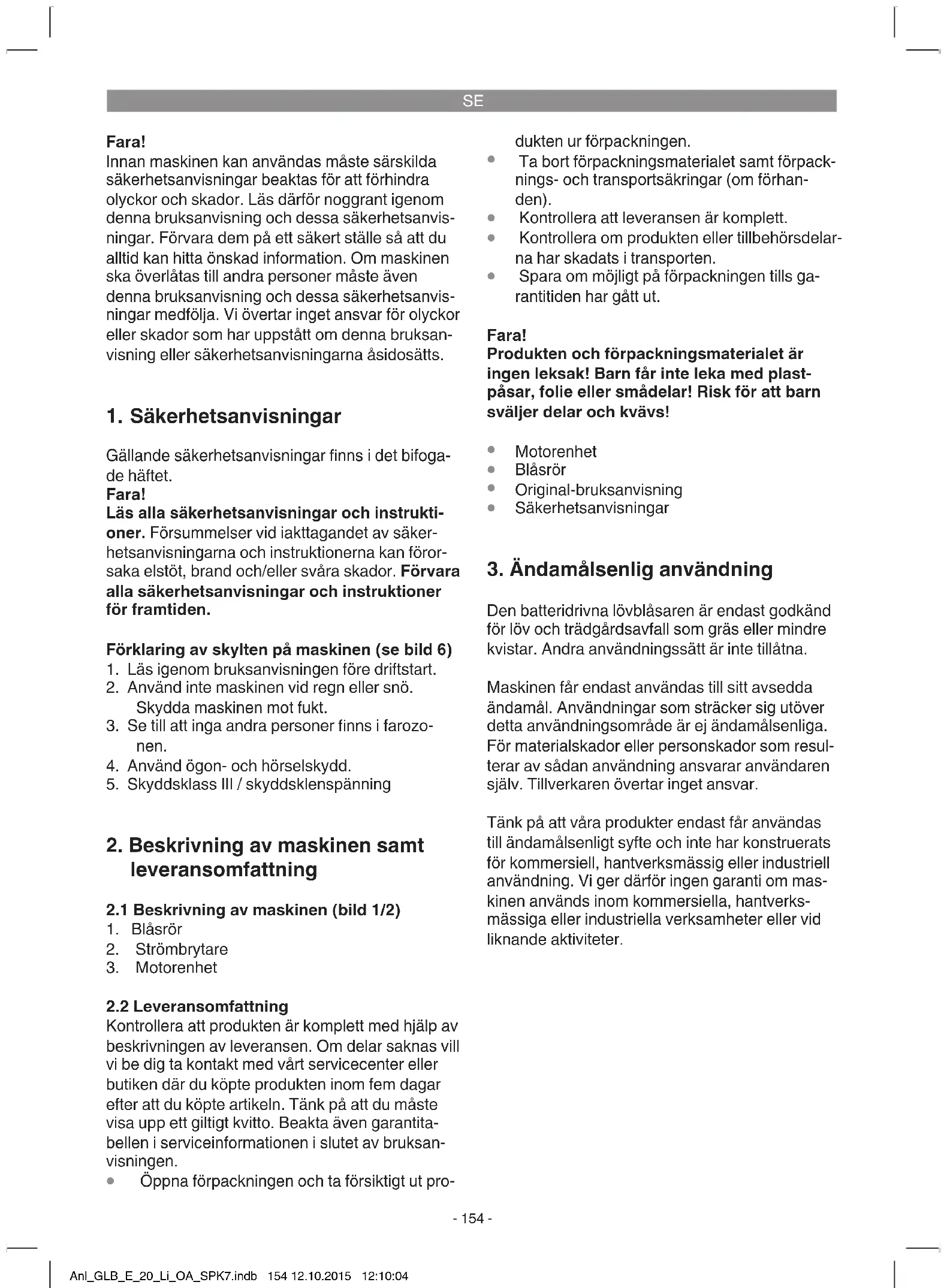 Den batteridrivna lövblåsaren är endast godkänd för löv och trädgårdsavfall som gräs eller mindre kvistar. Andra användningssätt är inte tillåtna. Maskinen får endast användas till sitt avsedda ändamål. Användningar som sträcker sig utöver detta användningsområde är ej ändamålsenliga. För materialskador eller personskador som resul- terar av sådan användning ansvarar användaren själv. Tillverkaren övertar inget ansvar. Tänk på att våra produkter endast får användas till ändamålsenligt syfte och inte har konstruerats för kommersiell, hantverksmässig eller industriell användning. Vi ger därför ingen garanti om mas- kinen används inom kommersiella, hantverks- mässiga eller industriella verksamheter eller vid liknande aktiviteter. Anl_GLB_E_20_Li_OA_SPK7.indb 154 12.10.2015 12:10:04SE