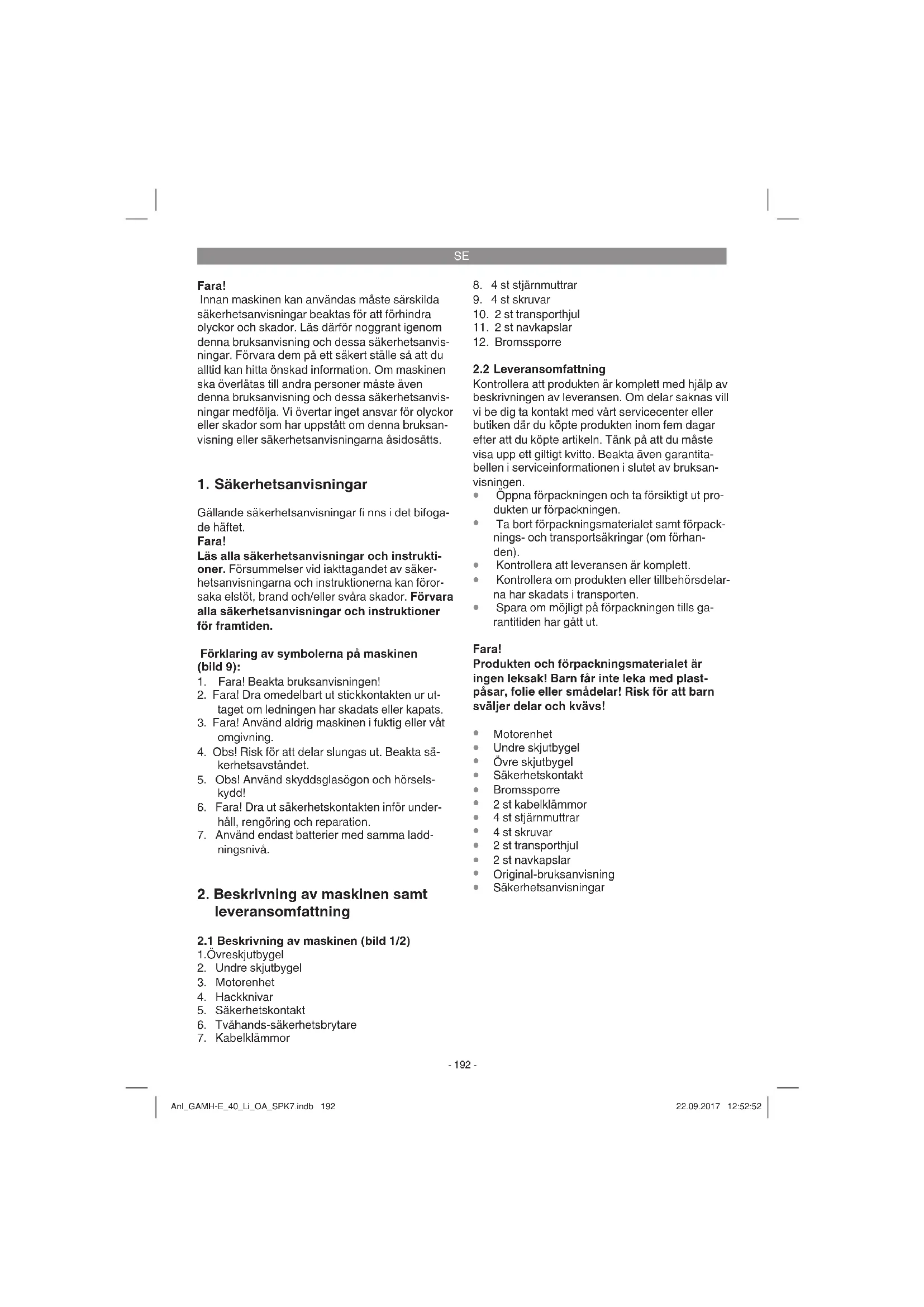 Endast för EU-länder Kasta inte elverktyg i hushållssoporna. Enligt det europeiska direktivet 2012/19/EG om avfall som utgörs av eller innehåller elektriska eller elektroniska produkter och dess tillämpning i den nationella lagstiftningen, måste förbrukade elverktyg källsorteras och lämnas in för miljövänlig återvinning. Återvinnings-alternativ till begäran om återsändning: Som ett alternativ till returnering är ägaren av elutrustningen skyldig att bidraga till ändamålsenlig av- fallshantering för det fall att utrustningen ska skrotas. Efter att den förbrukade utrustningen har lämnats in till en avfallsstation kan den omhändertas i enlighet med gällande nationella lagstiftning om återvin- ning och avfallshantering. Detta gäller inte för tillbehörsdelar och hjälpmedel utan elektriska komponen- ter vars syfte har varit att komplettera den förbrukade utrustningen. Eftertryck eller annan duplicering av dokumentation och medföljande underlag för produkterna, även utdrag, är endast tillåtet med uttryckligt tillstånd från iSC GmbH. Med förbehåll för tekniska ändringar. Anl_GAMH-E_40_Li_OA_SPK7.indb 199Anl_GAMH-E_40_Li_OA_SPK7.indb 199 22.09.2017 12:52:5322.09.2017 12:52:53SE