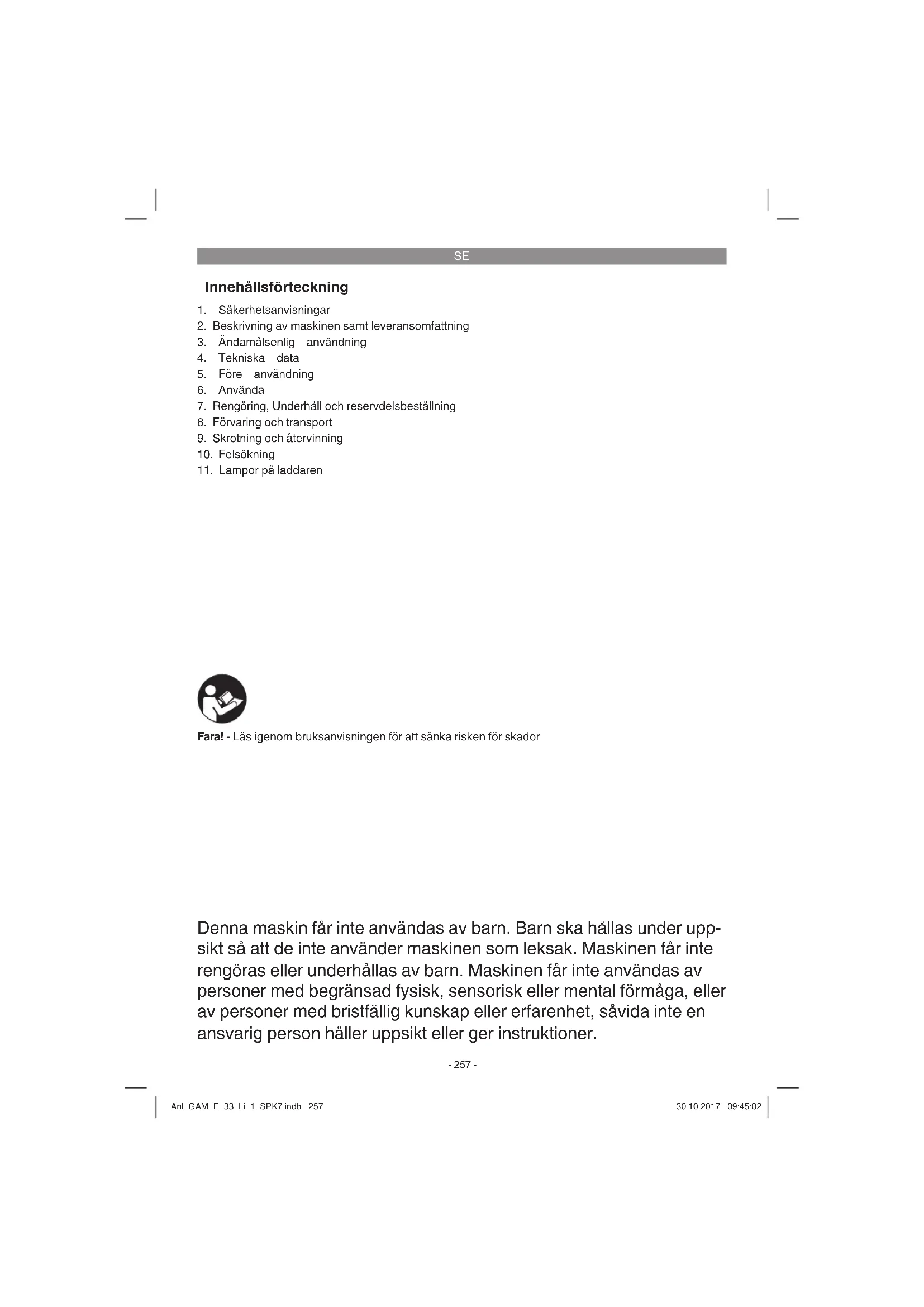 Denna maskin får inte användas av barn. Barn ska hållas under upp- sikt så att de inte använder maskinen som leksak. Maskinen får inte rengöras eller underhållas av barn. Maskinen får inte användas av personer med begränsad fysisk, sensorisk eller mental förmåga, eller av personer med bristfällig kunskap eller erfarenhet, såvida inte en ansvarig person håller uppsikt eller ger instruktioner. Fara! - Läs igenom bruksanvisningen för att sänka risken för skador Anl_GAM_E_33_Li_1_SPK7.indb 257Anl_GAM_E_33_Li_1_SPK7.indb 257 30.10.2017 09:45:0230.10.2017 09:45:02SE