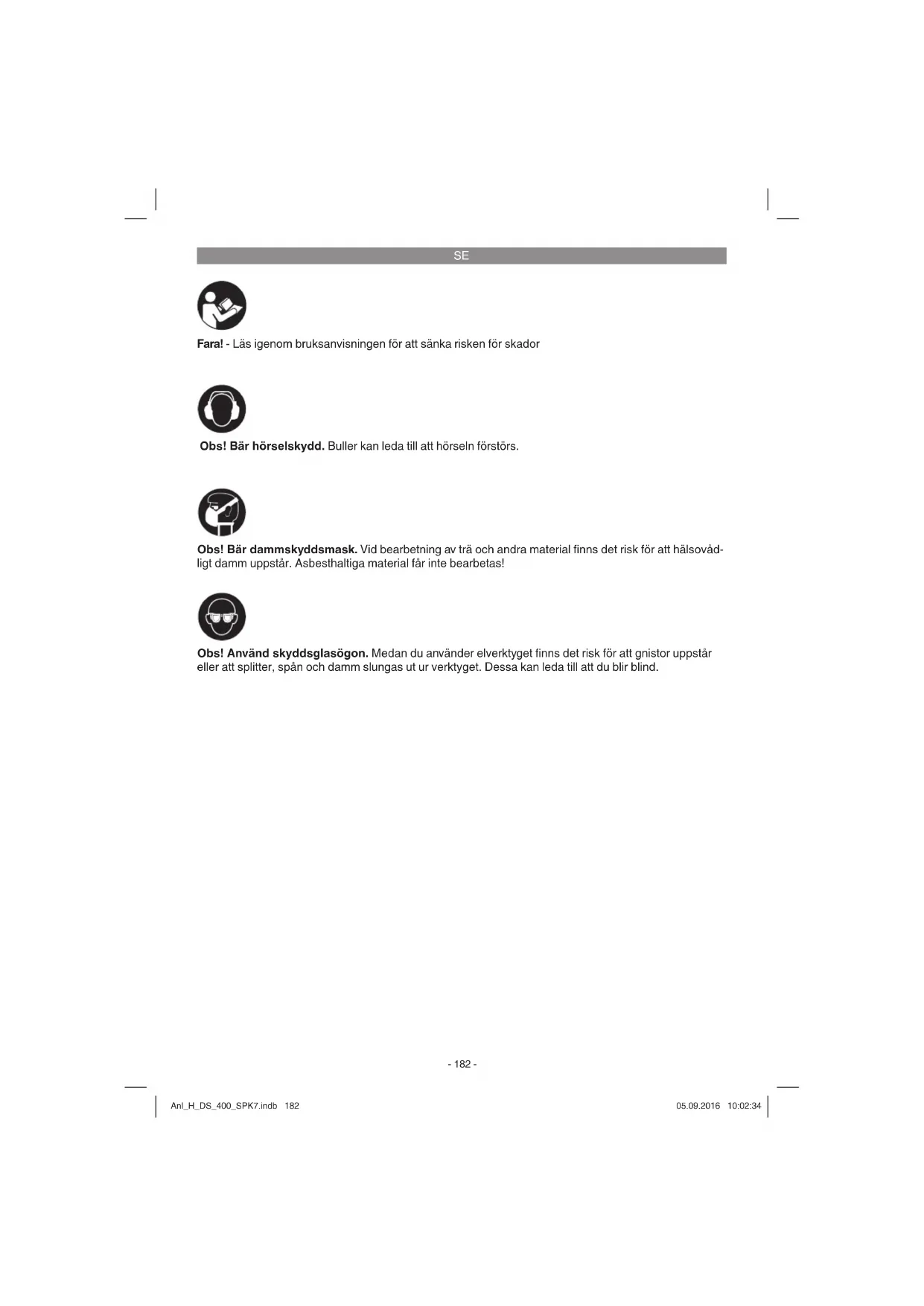 Fara! - Läs igenom bruksanvisningen för att sänka risken för skador Obs! Bär hörselskydd. Buller kan leda till att hörseln förstörs. Obs! Använd skyddsglasögon. Medan du använder elverktyget fi nns det risk för att gnistor uppstår eller att splitter, spån och damm slungas ut ur verktyget. Dessa kan leda till att du blir blind. Obs! Bär dammskyddsmask. Vid bearbetning av trä och andra material fi nns det risk för att hälsovåd- ligt damm uppstår. Asbesthaltiga material får inte bearbetas! Anl_H_DS_400_SPK7.indb 182Anl_H_DS_400_SPK7.indb 182 05.09.2016 10:02:3405.09.2016 10:02:34SE