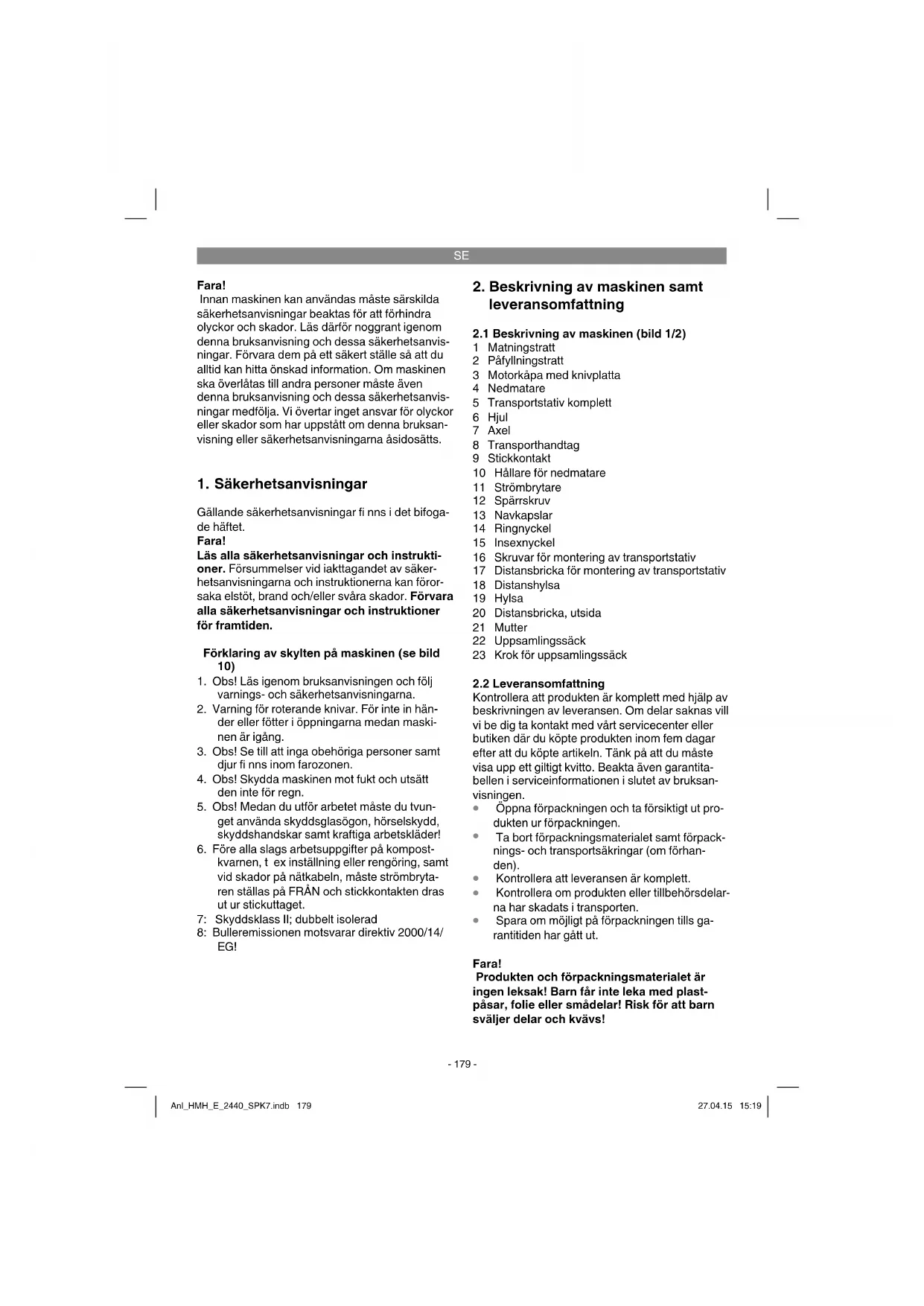 Spara om möjligt på förpackningen tills ga- rantitiden har gått ut. Fara! Produkten och förpackningsmaterialet är ingen leksak! Barn får inte leka med plast- påsar, folie eller smådelar! Risk för att barn sväljer delar och kvävs! Anl_HMH_E_2440_SPK7.indb 179Anl_HMH_E_2440_SPK7.indb 179 27.04.15 15:1927.04.15 15:19SE