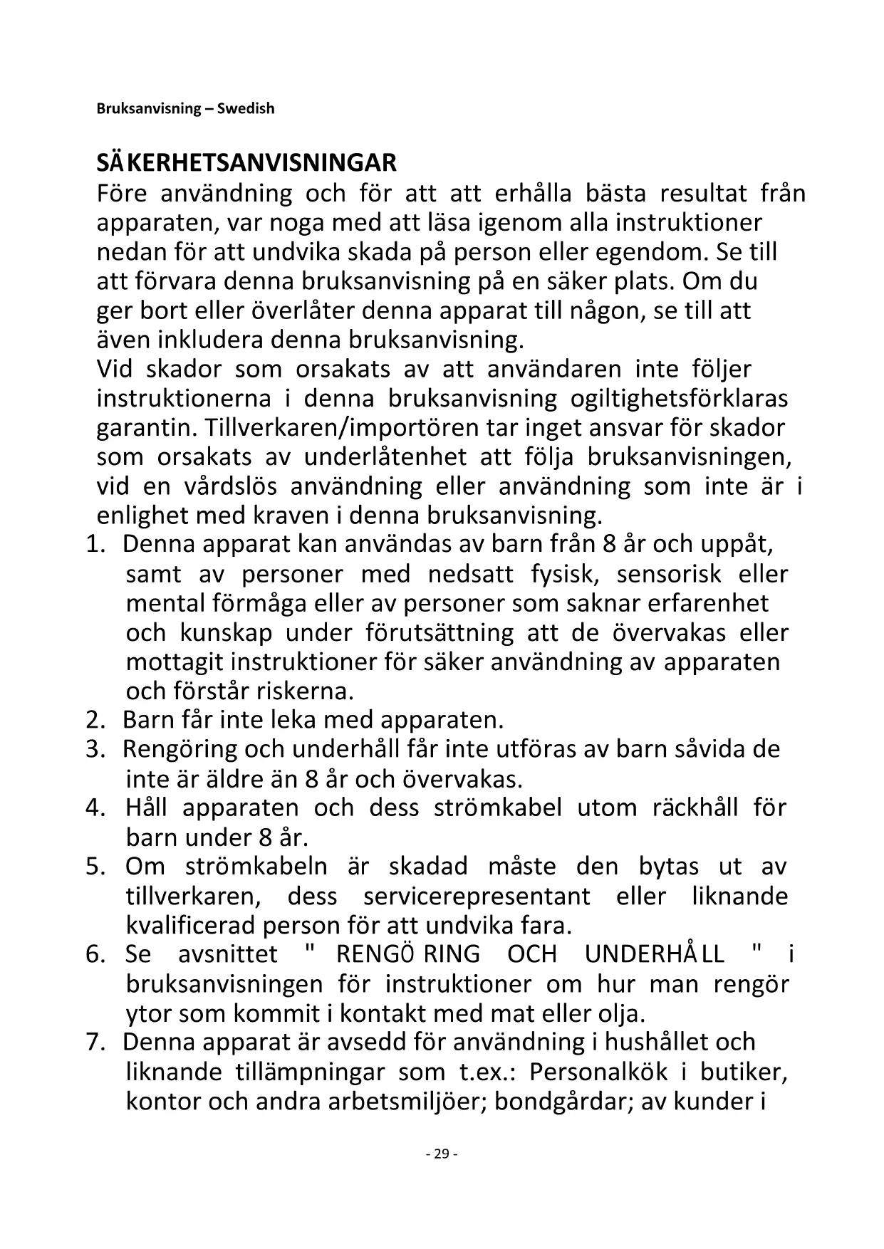 Recyclage – Directive européenne 2012/19/EU Ce symbole indique que le produit ne doit pas être jeté avec les ordures ménagères. Pour limiter les risques pour l’environnement et la santé entraînés par le rejet non contrôlé des déchets, recyclez ce dernier pour promouvoir une réutilisation responsable de ses matériaux. Pour recycler votre produit, utilisez les réseaux de collecte de votre région ou prenez contact avec le revendeur du produit. Ce dernier pourra vous aider à le recycler. Emerio Deutschland GmbH (no service address)- 28 - Emerio B.V. Customer service: Kundeninformation: Klantenservice: Oudeweg 115 T: +31 (0) 23 3034369 T: +49 (0) 3222 1097 600 T: +31 (0) 23 3034369 2031 CC Haarlem www.emerio.eu/service www.emerio.eu/service www.emerio.eu/service The Netherlands Looking for spare parts? Have a look at https://spareparts.emerio.eu Sie brauchen Ersatzteile? Besuchen Sie https://ersatzteile.emerio.eu Onderdelen nodig? Kijk op https://onderdelen.emerio.eu- 29 - Bruksanvisning – Swedish SÄKERHETSANVISNINGAR Före användning och för att att erhålla bästa resultat från apparaten, var noga med att läsa igenom alla instruktioner nedan för att undvika skada på person eller egendom. Se till att förvara denna bruksanvisning på en säker plats. Om du ger bort eller överlåter denna apparat till någon, se till att även inkludera denna bruksanvisning. Vid skador som orsakats av att användaren inte följer instruktionerna i denna bruksanvisning ogiltighetsförklaras garantin. Tillverkaren/importören tar inget ansvar för skador som orsakats av underlåtenhet att följa bruksanvisningen, vid en vårdslös användning eller användning som inte är i enlighet med kraven i denna bruksanvisning.