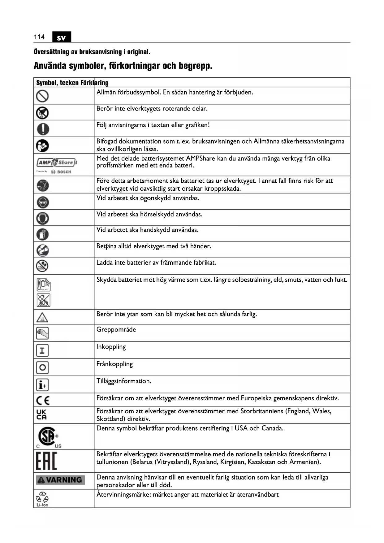 Översättning av bruksanvisning i original. Använda symboler, förkortningar och begrepp. Symbol, tecken Förklaring Allmän förbudssymbol. En sådan hantering är förbjuden. Berör inte elverktygets roterande delar. Följ anvisningarna i texten eller grafiken! Bifogad dokumentation som t. ex. bruksanvisningen och Allmänna säkerhetsanvisningarna ska ovillkorligen läsas. Med det delade batterisystemet AMPShare kan du använda många verktyg från olika proffsmärken med ett enda batteri. Före detta arbetsmoment ska batteriet tas ur elverktyget. I annat fall finns risk för att elverktyget vid oavsiktlig start orsakar kroppsskada. Vid arbetet ska ögonskydd användas. Vid arbetet ska hörselskydd användas. Vid arbetet ska handskydd användas. Betjäna alltid elverktyget med två händer. Ladda inte batterier av främmande fabrikat. Skydda batteriet mot hög värme som t.ex. längre solbestrålning, eld, smuts, vatten och fukt. Berör inte ytan som kan bli mycket het och sålunda farlig. Greppområde Inkoppling Frånkoppling Tilläggsinformation. Försäkrar om att elverktyget överensstämmer med Europeiska gemenskapens direktiv. Försäkrar om att elverktyget överensstämmer med Storbritanniens (England, Wales, Skottland) direktiv. Denna symbol bekräftar produktens certifiering i USA och Canada. Bekräftar elverktygets överensstämmelse med de nationella tekniska föreskrifterna i tullunionen (Belarus (Vitryssland), Ryssland, Kirgisien, Kazakstan och Armenien). Denna anvisning hänvisar till en eventuellt farlig situation som kan leda till allvarliga personskador eller till död. Återvinningsmärke: märket anger att materialet är återanvändbart max.50°C115