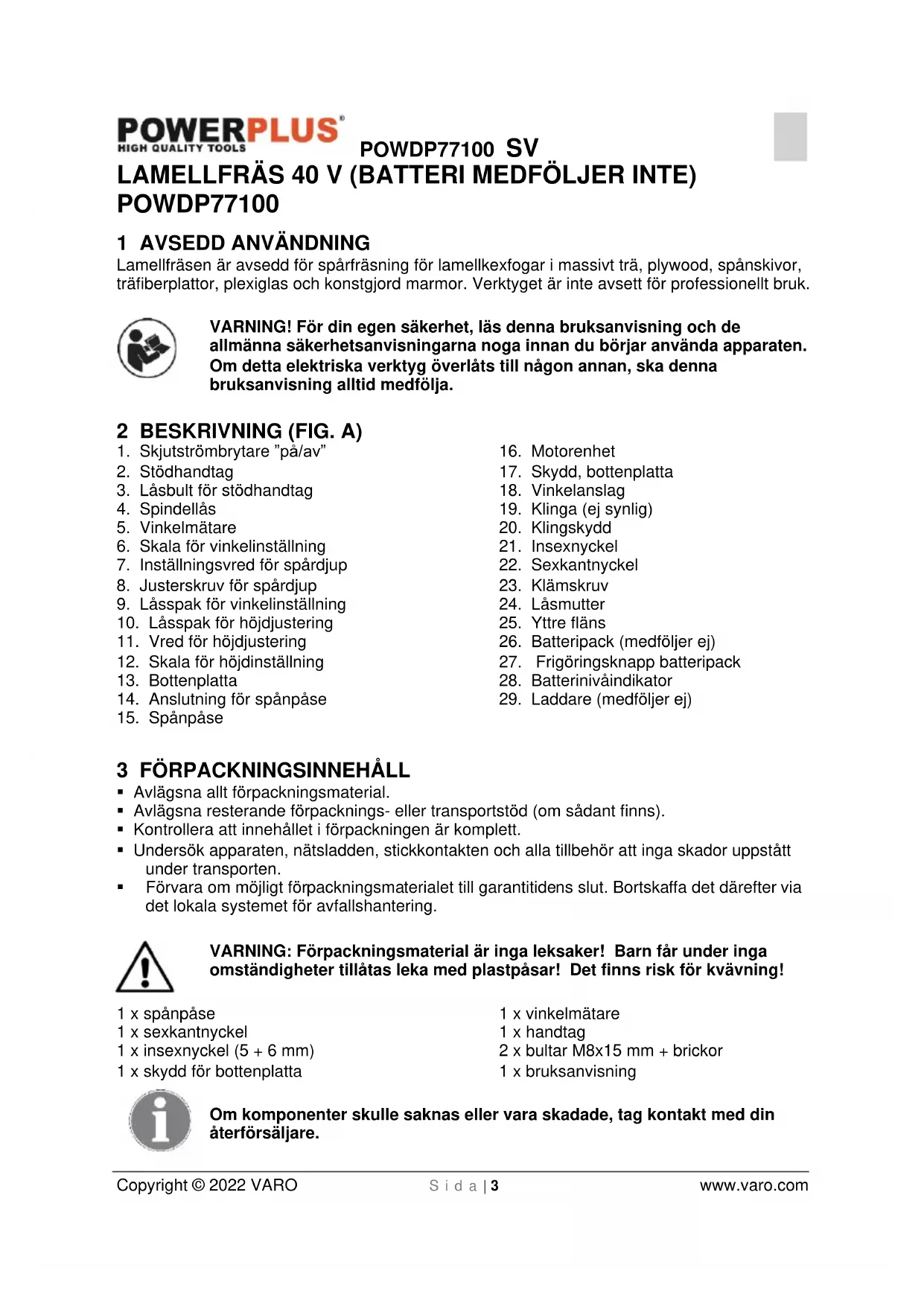 - Låt endast kvalificerat fackfolk reparera verktyget med användande av originalreservdelar. Detta för att garantera att verktygets säkerhetsstandards vidmakthålls.POWDP77100 SV Copyright © 2022 VARO S i d a | 6 www.varo.com
