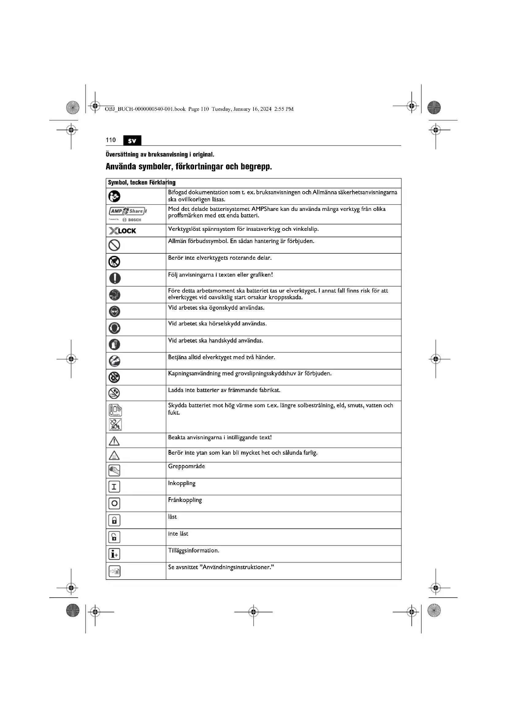 Översättning av bruksanvisning i original. Använda symboler, förkortningar och begrepp. Symbol, tecken Förklaring Bifogad dokumentation som t. ex. bruksanvisningen och Allmänna säkerhetsanvisningarna ska ovillkorligen läsas. Med det delade batterisystemet AMPShare kan du använda många verktyg från olika proffsmärken med ett enda batteri. Verktygslöst spännsystem för insatsverktyg och vinkelslip. Allmän förbudssymbol. En sådan hantering är förbjuden. Berör inte elverktygets roterande delar. Följ anvisningarna i texten eller grafiken! Före detta arbetsmoment ska batteriet tas ur elverktyget. I annat fall finns risk för att elverktyget vid oavsiktlig start orsakar kroppsskada. Vid arbetet ska ögonskydd användas. Vid arbetet ska hörselskydd användas. Vid arbetet ska handskydd användas. Betjäna alltid elverktyget med två händer. Kapningsanvändning med grovslipningsskyddshuv är förbjuden. Ladda inte batterier av främmande fabrikat. Skydda batteriet mot hög värme som t.ex. längre solbestrålning, eld, smuts, vatten och fukt. Beakta anvisningarna i intilliggande text! Berör inte ytan som kan bli mycket het och sålunda farlig. Greppområde Inkoppling Frånkoppling låst inte låst Tilläggsinformation. Se avsnittet ”Användningsinstruktioner.” max.50°C OBJ_BUCH-0000000540-001.book Page 110 Tuesday, January 16, 2024 2:55 PM111