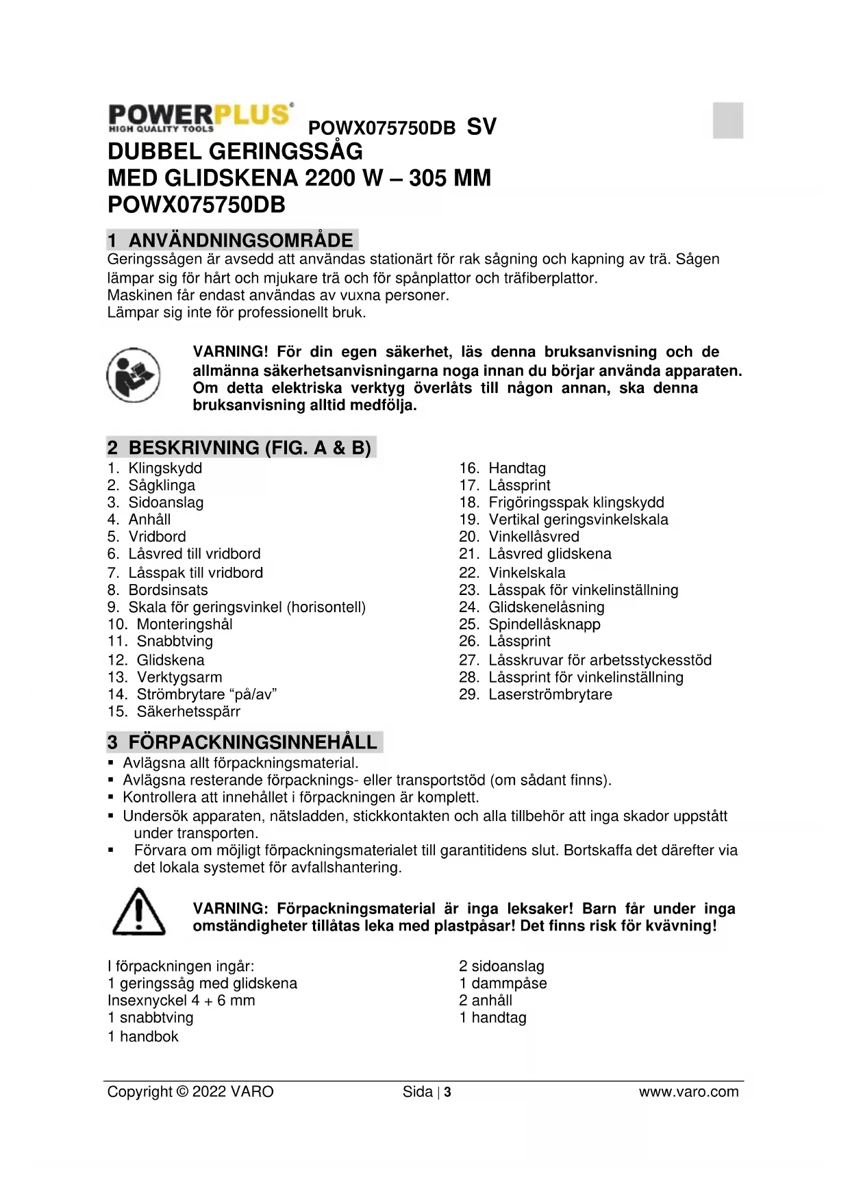 - Böj dig ALDRIG ned över eller kring sågklingan. Ta ALDRIG tag i ett arbetsstycke innan sågklingan står helt stilla.POWX075750DB SV Copyright © 2022 VARO Sida | 7 www.varo.com