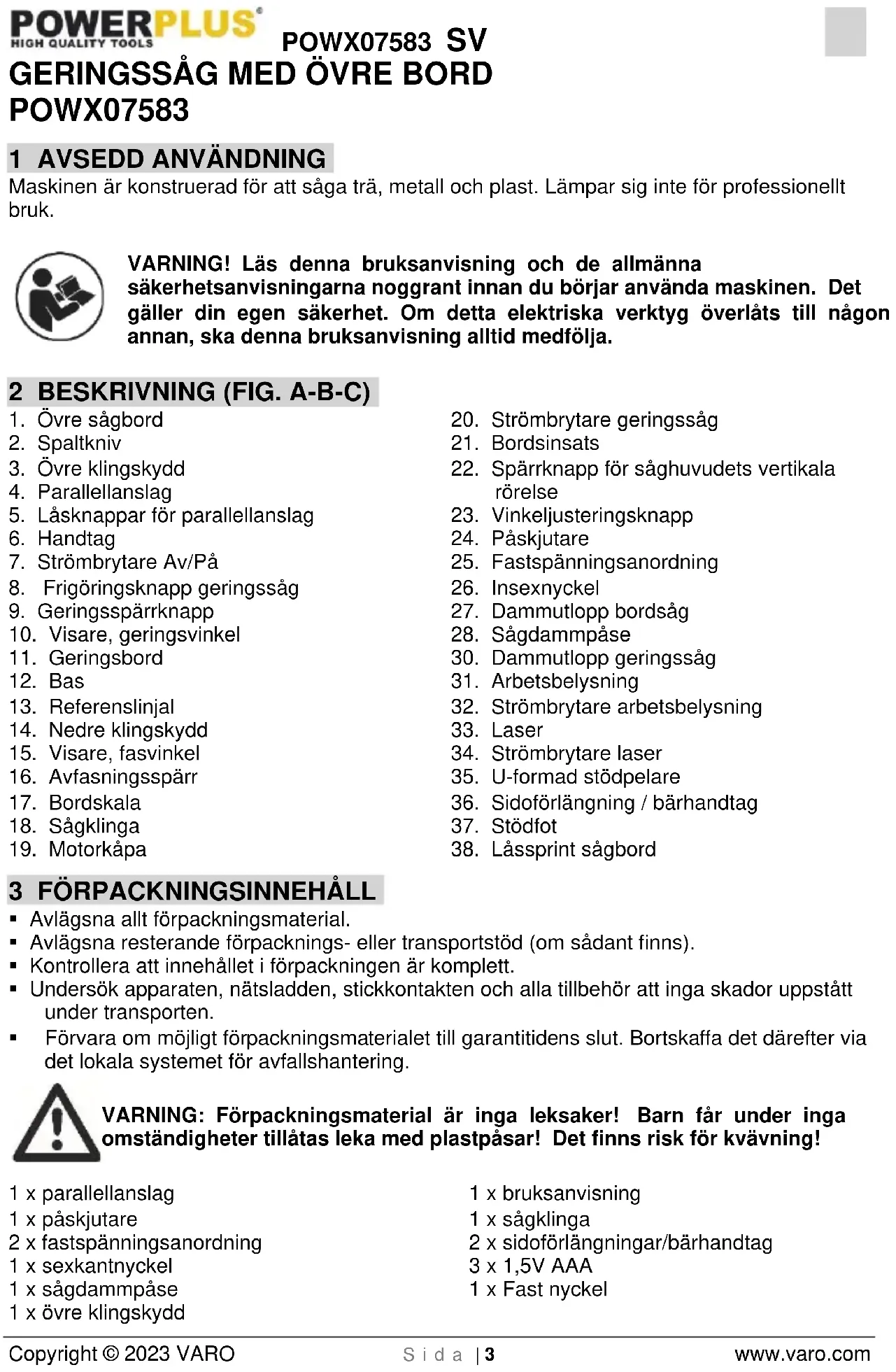 - Förvara om möjligt förpackningsmaterialet till garantitidens slut. Bortskaffa det därefter via det lokala systemet för avfallshantering. VARNING: Förpackningsmaterial är inga leksaker! Barn får under inga omständigheter tillåtas leka med plastpåsar! Det finns risk för kvävning! 1 x parallellanslag 1 x påskjutare 2 x fastspänningsanordning 1 x sexkantnyckel 1 x sågdammpåse 1 x övre klingskydd 1 x bruksanvisning 1 x sågklinga 2 x sidoförlängningar/bärhandtag 3 x 1,5V AAA 1 x Fast nyckelPOWX07583 SV Copyright © 2023 VARO S i d a | 4 www.varo.com Om komponenter skulle saknas eller vara skadade, tag kontakt med din återförsäljare. 4 SYMBOLER Följande symboler används i bruksanvisningen och/eller på maskinen: