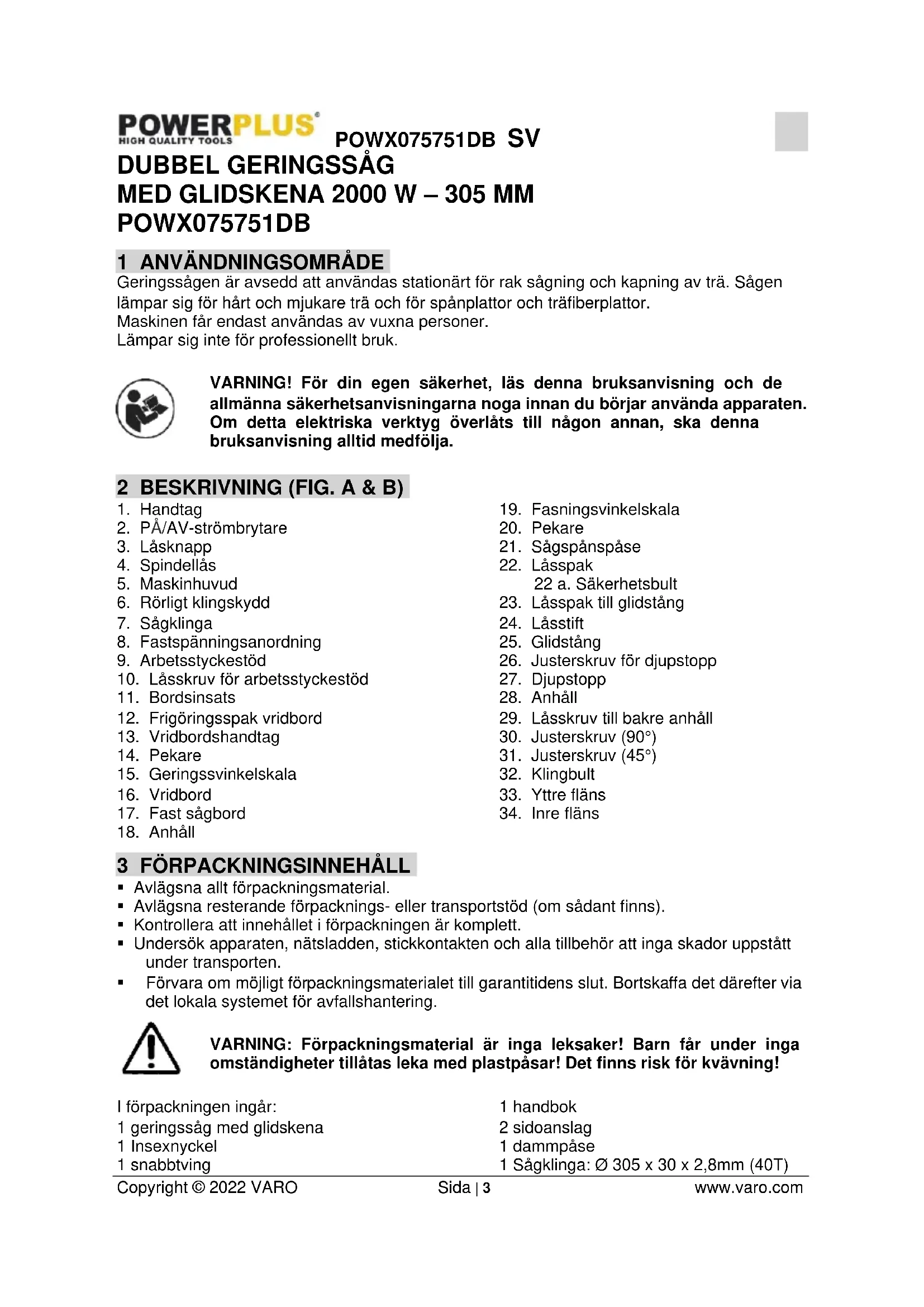- Böj dig ALDRIG ned över eller kring sågklingan. Ta ALDRIG tag i ett arbetsstycke innan sågklingan står helt stilla.POWX075751DB SV Copyright © 2022 VARO Sida | 7 www.varo.com