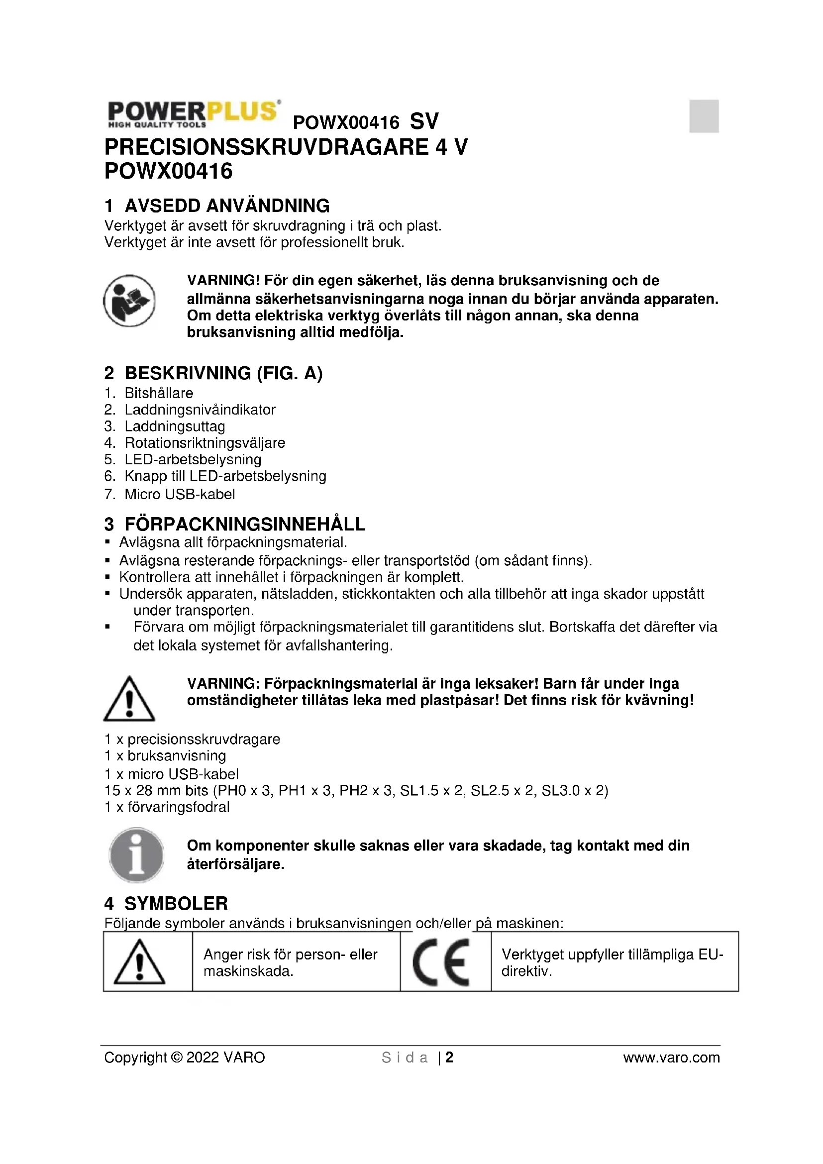 - Använd säkerhetsutrustning. Bär alltid skyddsglasögon. Säkerhetsutrustning som dammskyddsmask, halkfria säkerhetsskodon, skyddshjälm och hörselskydd, beroende på arbetets art, minskar risken för personskador.POWX00416 SV Copyright © 2022 VARO S i d a | 4 www.varo.com