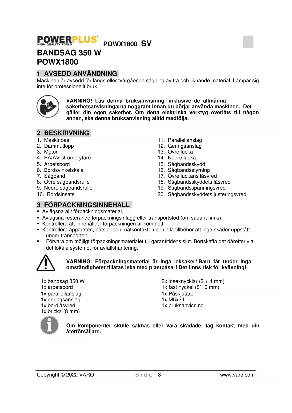 Smörj regelbundet sågbandets styrningar (19) (20) (21) (övre och undre). 12 TEKNISKA DATA Nätspänning 230-240 V~ Nätfrekvens 50 Hz Effekt 350 W (S2:10min) Motortyp Induktionsmotor Sågbandets hastighet 630 m/min Sågbandets längd 1511 mm Sågbandets bredd 6,5 mm Max. sågdjup 89 mm Max. sågbredd 228 mm Bordets storlek 313 x 302 mm Gering 0°-45° Vikt 19 kg Dammutloppets diameter 63,5 mmPOWX1800 SV Copyright © 2022 VARO S i d a | 12 www.varo.com 13 BULLER Bulleremissionsvärden uppmätta enligt tillämplig standard. (K=3) Ljudtrycksnivå LpA 91 dB(A) Ljudeffektnivå LwA 99 dB(A) OBS! Bär hörselskydd när ljudtrycket överstiger 85 dB(A). 14 SERVICEVERKSTAD